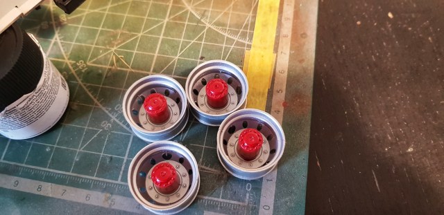 Лучше бы конечно было наоборот, сначала диск в красный задуть, а затем ступицу уже замаскировать и серебрянкой пройтись.