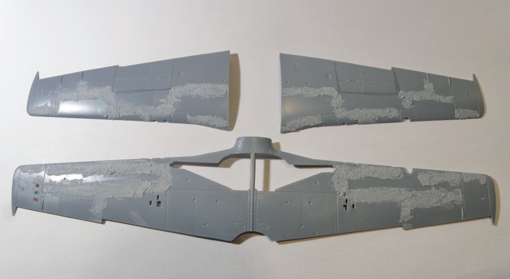 Итак начнем-с... Первым делом шпаклюю ненужную расшивку на крыле. В процессе работы размышляю: "почему за сколько лет ни один производитель так и не выпустил Мустанга с зашпаклеванным крылом?"