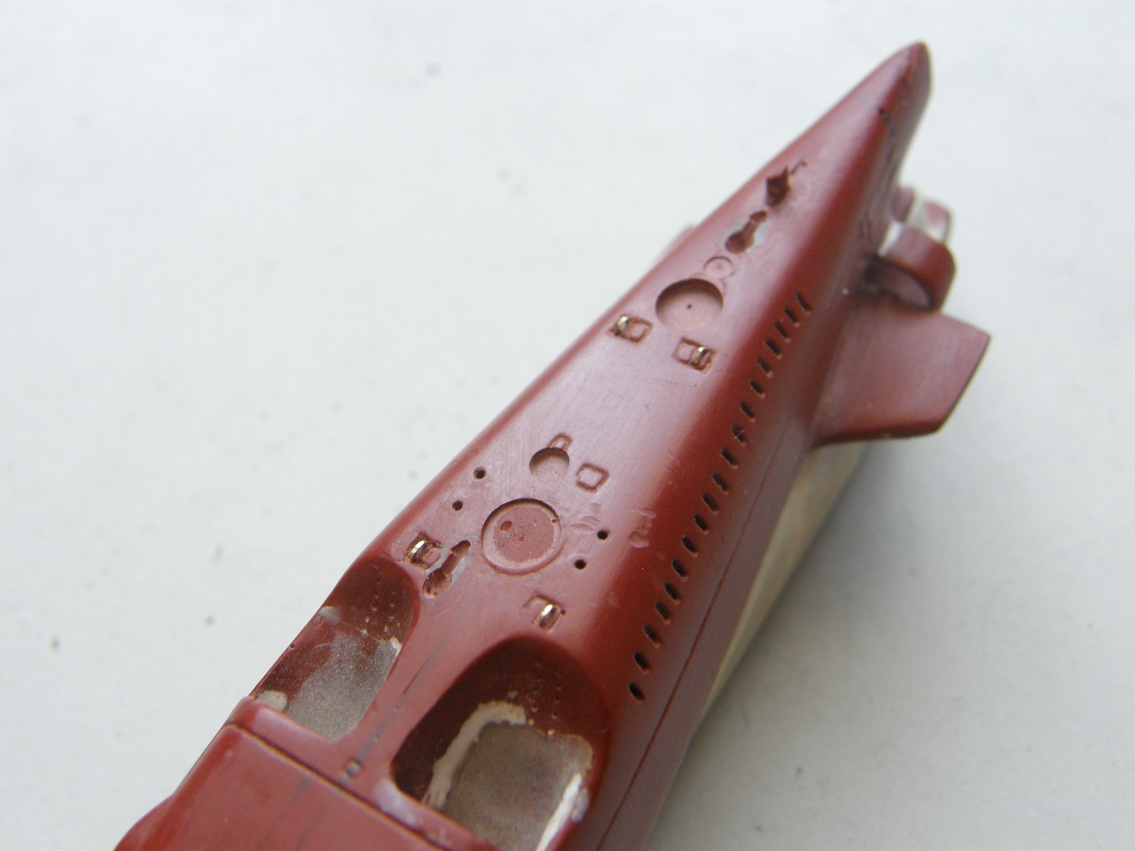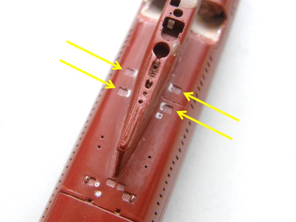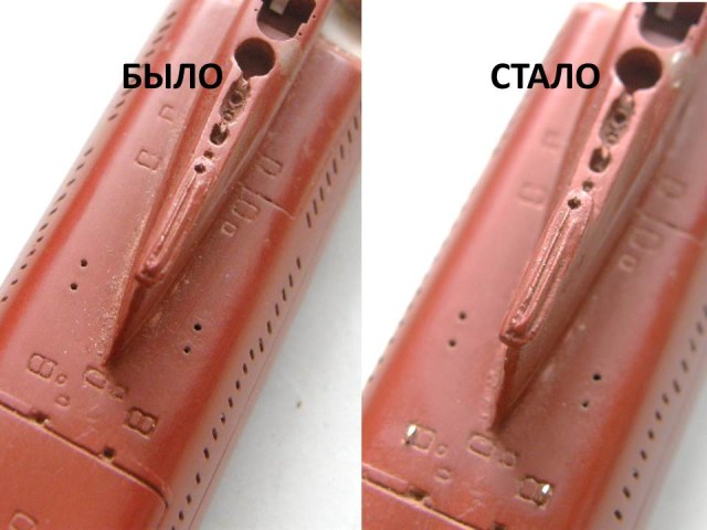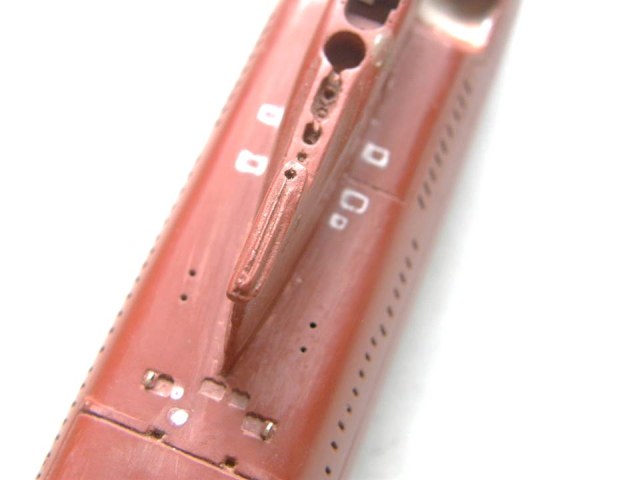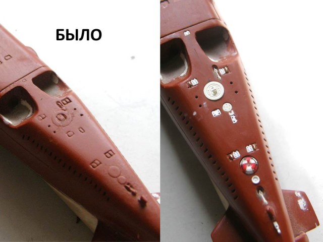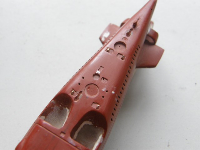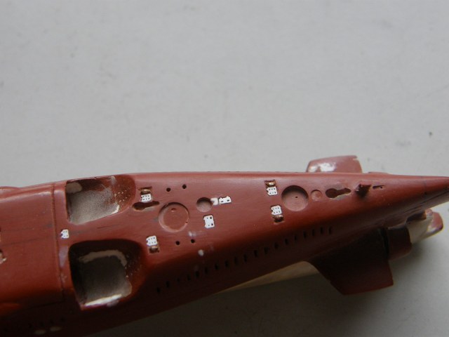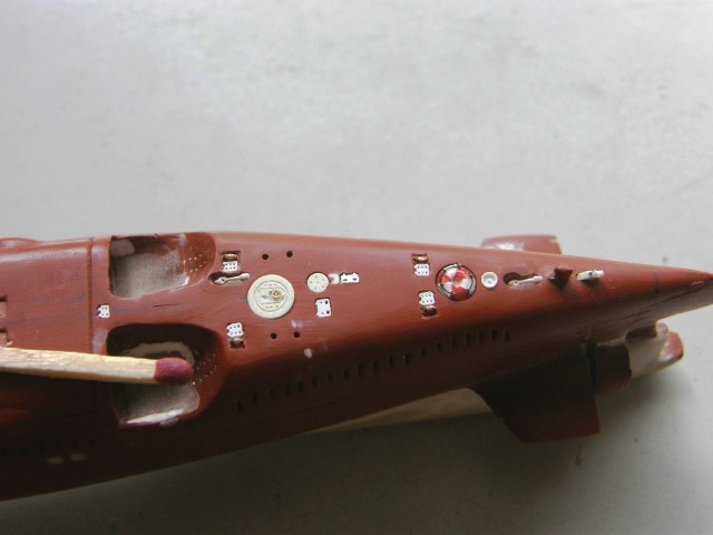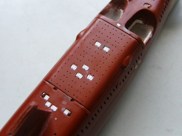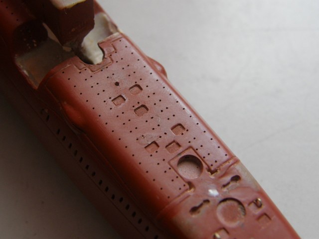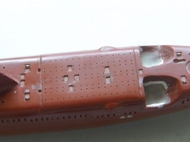 В кормовой части палубы палубы надстройки в районе ОР отфрезеровал гнезда под посадочные места лючков на 0,1 мм больше размеров самого лючка и глубиной 0,2 мм и с помощью сверхжидкой шпаклевки от Тамии, предназначенной для пластика подкорректировал палубу надстройки.