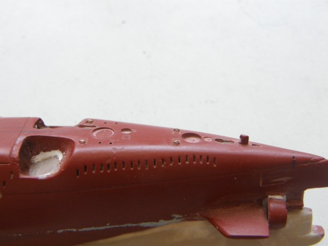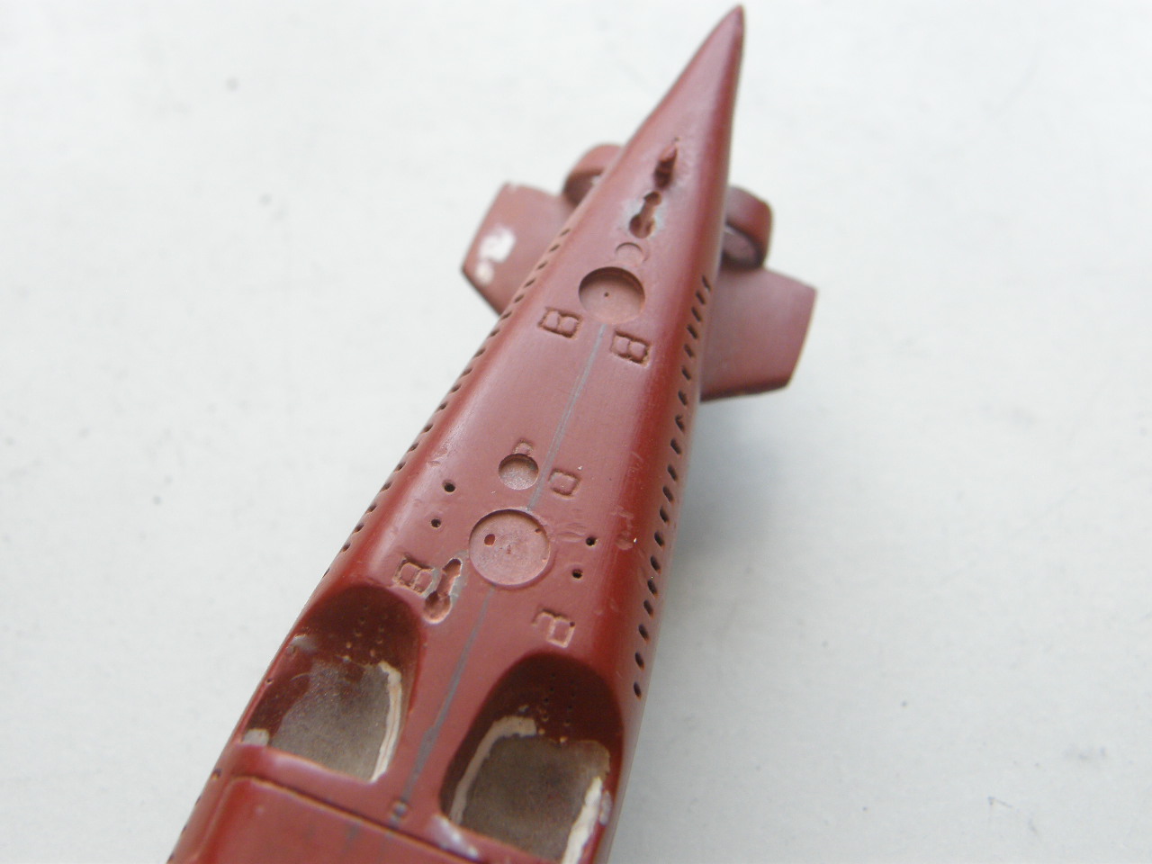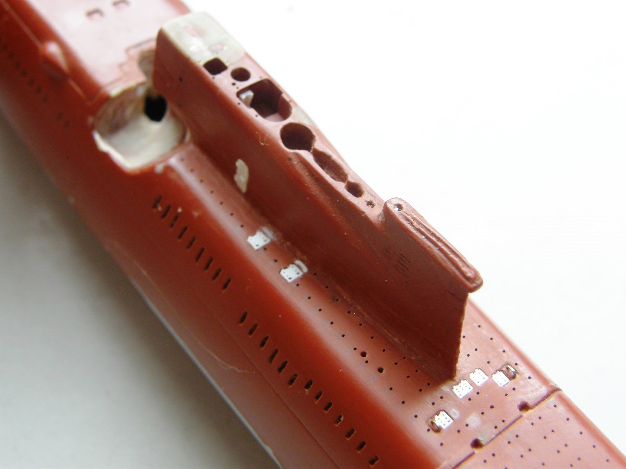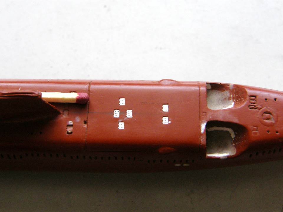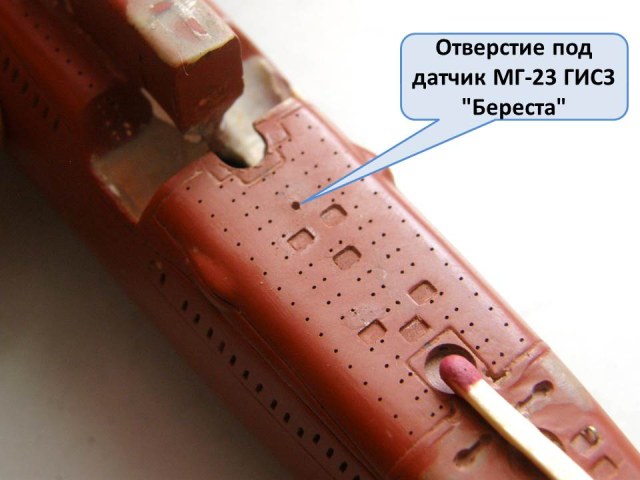 Высверлил палубные шпигаты в палубе носовых ракетных контейнеров сверлом 0,3 мм и глубиной 0,5 мм, добавив еще одно отверстие под датчик МГ-23 ГИСЗ "Береста" (на сленге подводников - Рога), изготовленного ранее (ссылка).