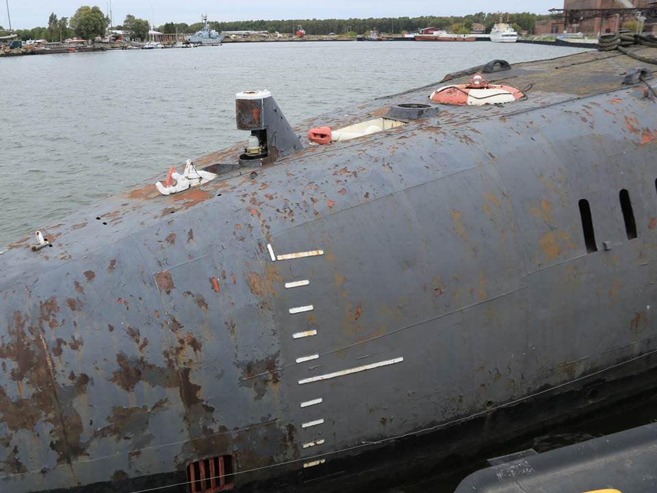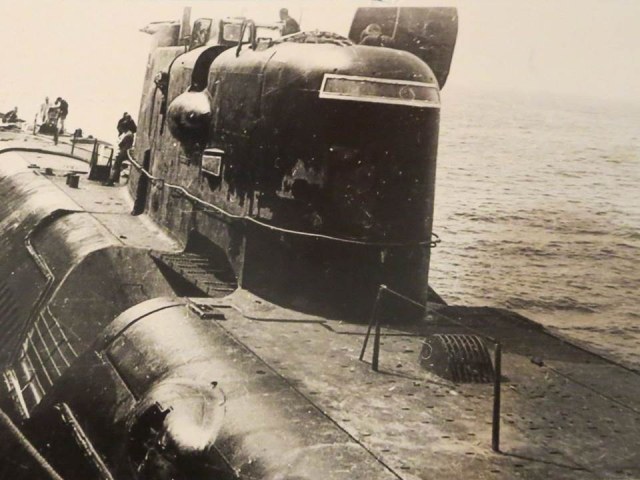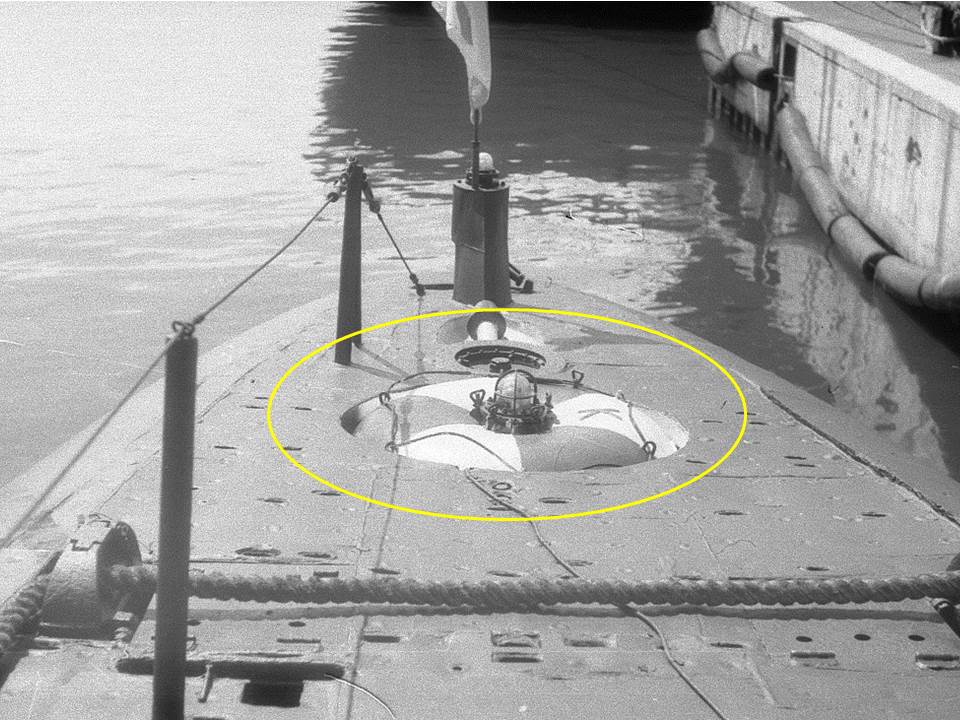 Но мне повезло, и в начале лета обнаружилась очень редкая фотография носовой части подводной лодки 651Э проекта датированная 1987 годом, на которой носовой АСБ был с антенно-фидерным устройством (АФУ) красного цвета, позволявшим обеспечить радиосвязь аварийной ПЛ с аварийно-спасательными силами на дистанции 10 - 15 км.