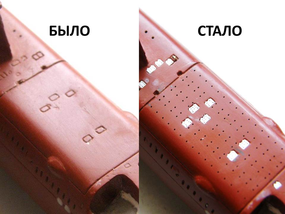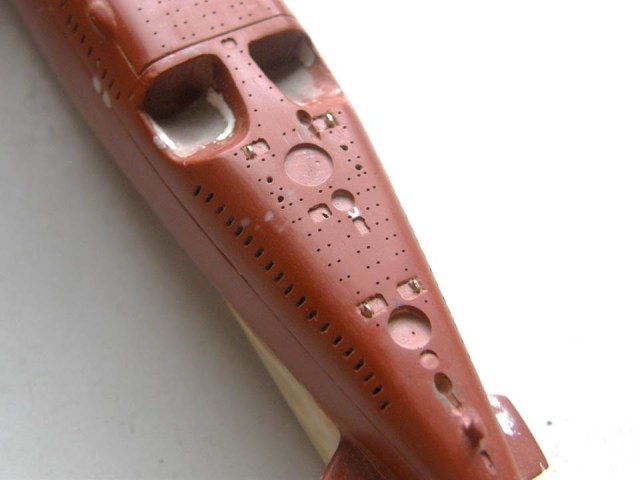 Сверлом 0,3 мм сделал в пластике четыре ряда палубных шпигатов глубиной 0,5 мм.