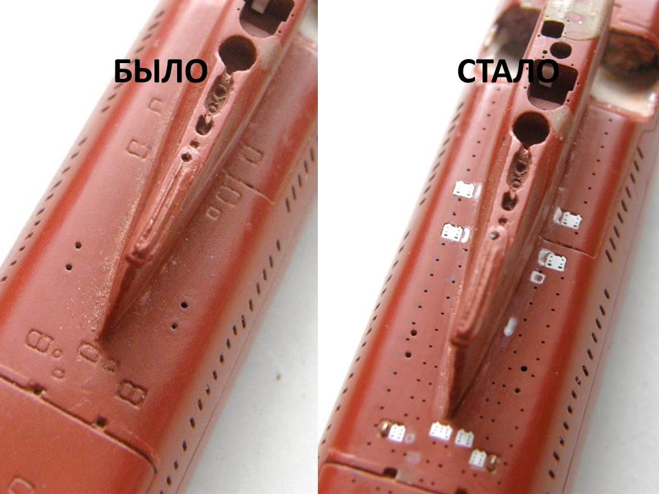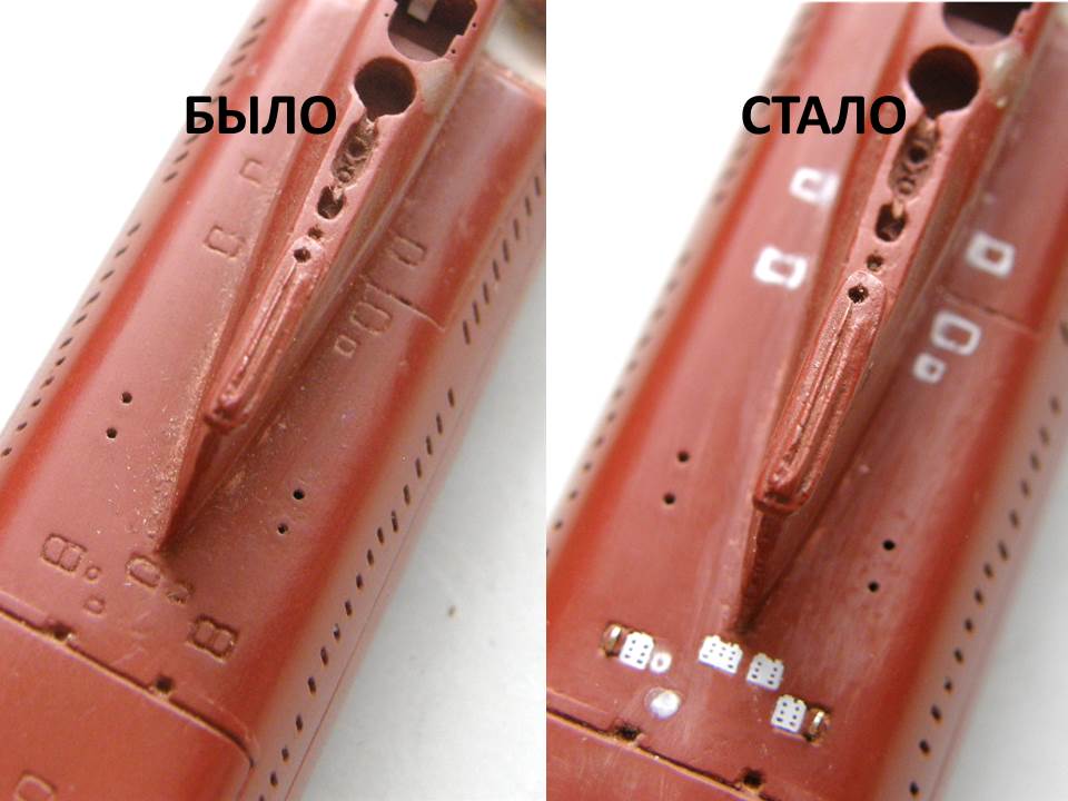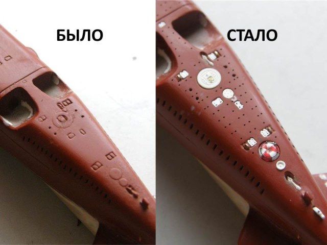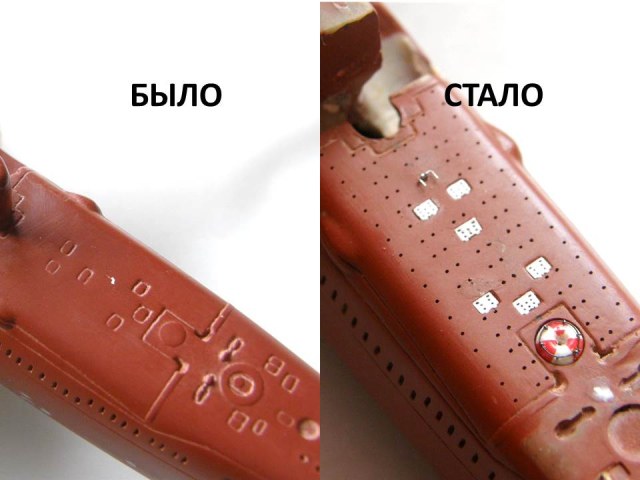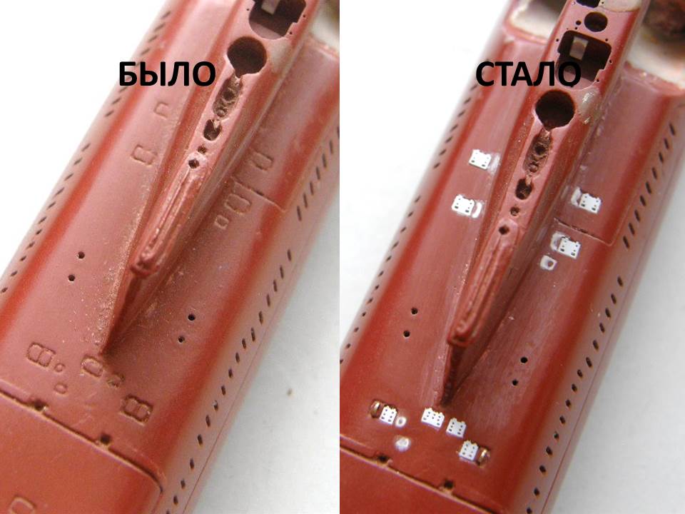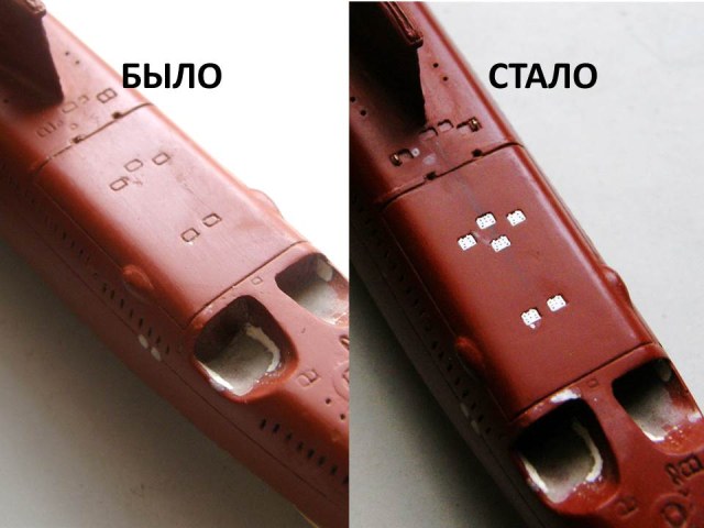 И началась работа сверлом. Окончательно высверлил палубные шпигаты в палубе кормовых ракетных контейнеров и исправил с помощью двухкомпонентной шпаклевки от EpoPutty и фрезеровки положение выреза в палубе надстройки для обслуживания передней крышки четвертого контейнера (левый борт), заодно облагородил и вырез для третьего контейнера (правый борт).