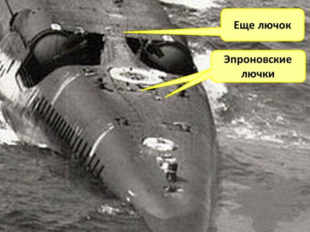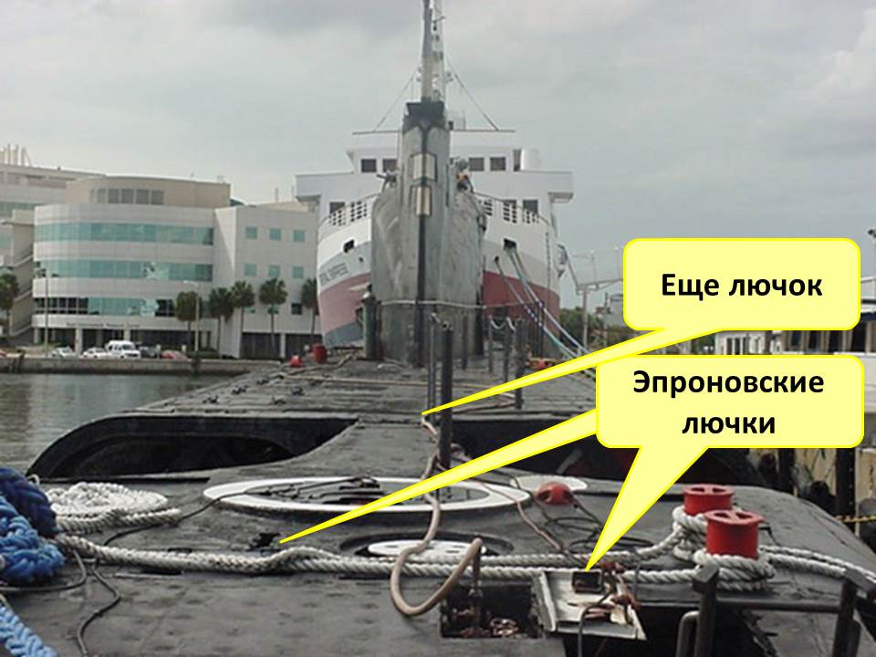 На палубе надстройки симметрично ОР (ограждения рубки) находились по два эпроновских лючка побортно.