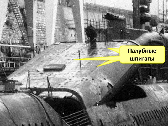 На остальных подводных лодках 651 проекта, в отличие от К-156, легко узнаваемых по носовому обтекателю МГ-25, на которых не было установлено морского гидроакустического сигнализатора МГС-29 (станция обозначения аварийной пл), эти стойки также укладывались от носового входного люка вдоль диаметральной плоскости подводной лодки в нос.