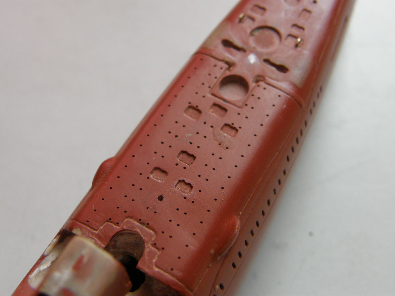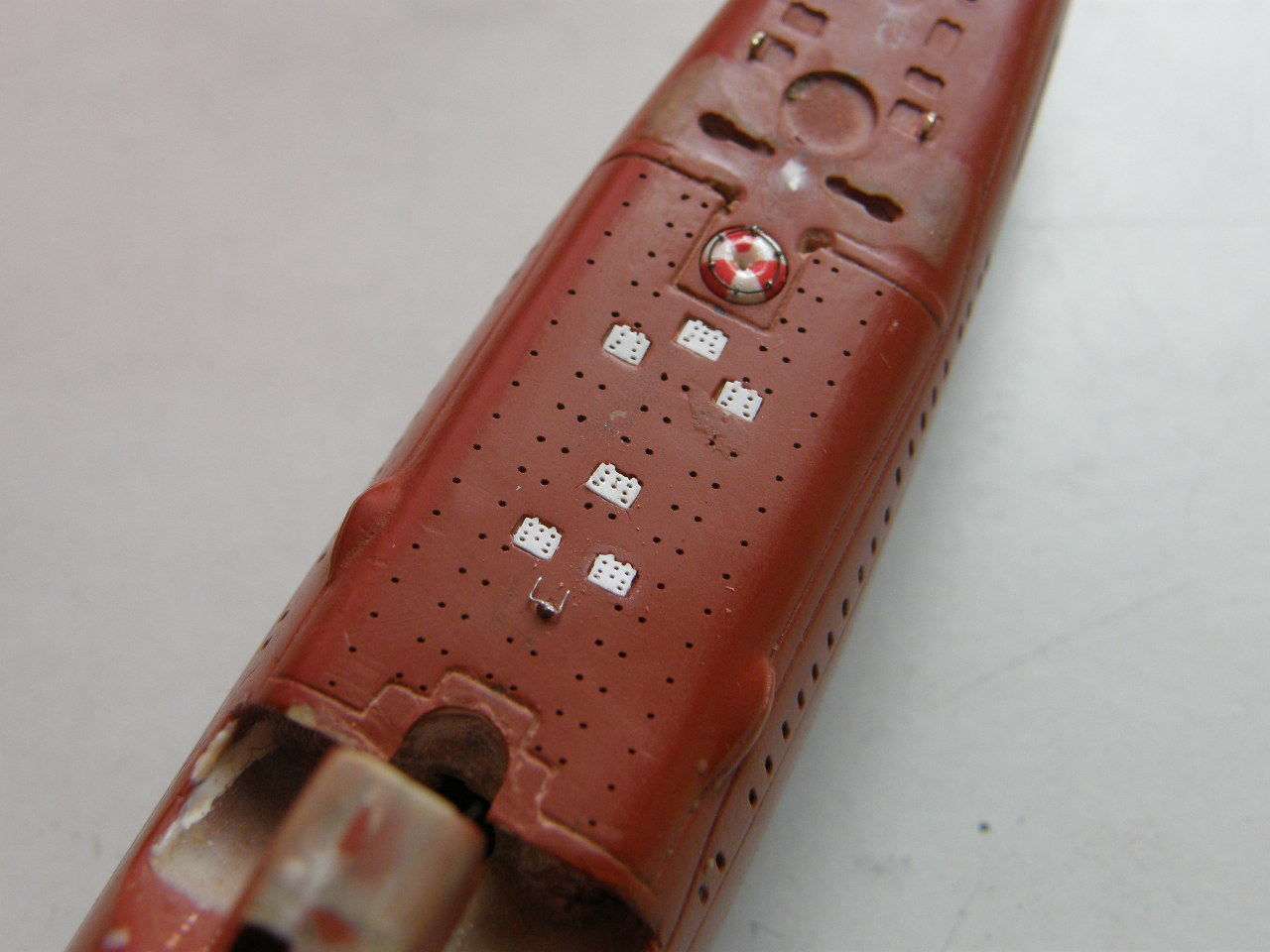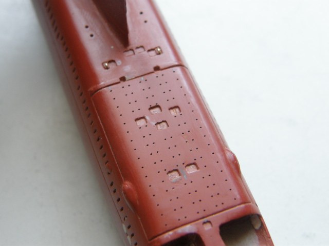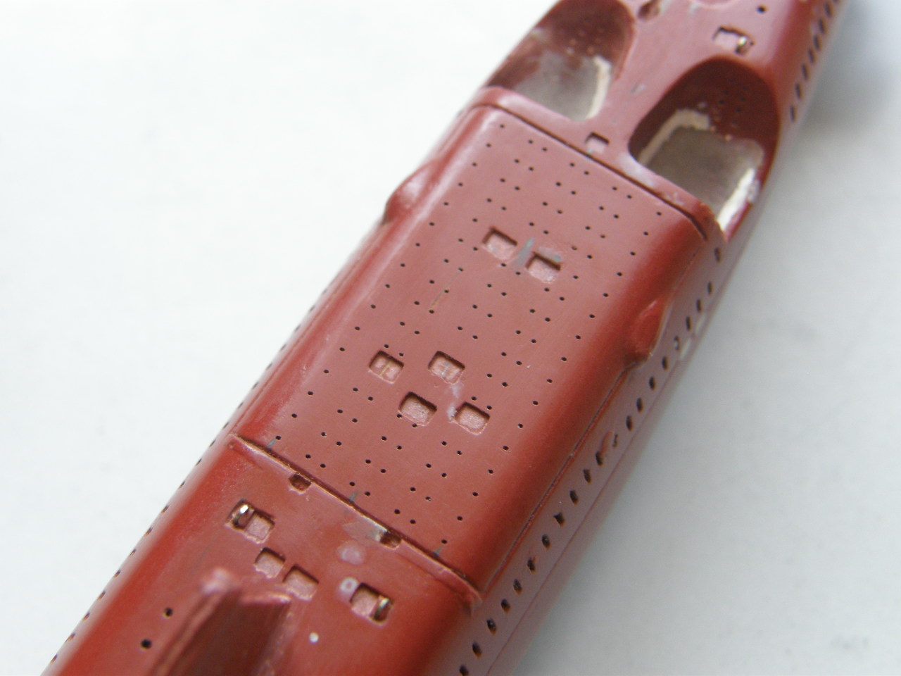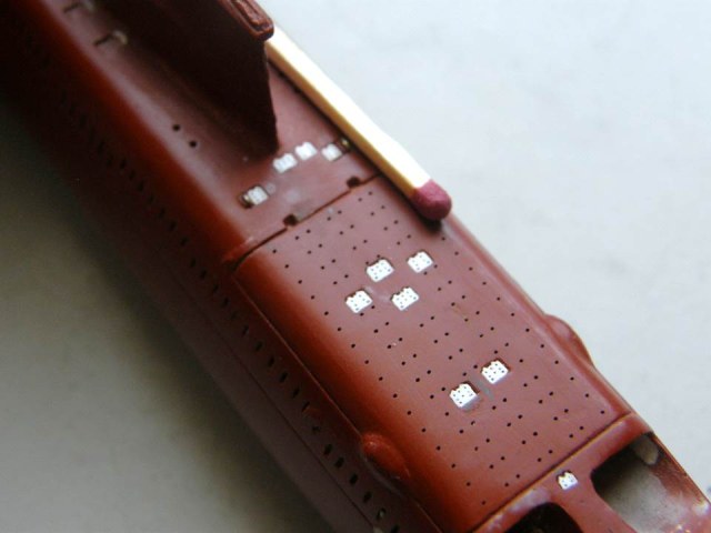 Окончательно высверлил палубные шпигаты в палубе надстройки в районе ОР сверлом 0,3 мм и глубиной 0,5 мм, оставив форму палубных шпигатов прежней – прямоугольника с закругленными углами. Процесс сверления несколько осложняло критическая близость ОР.