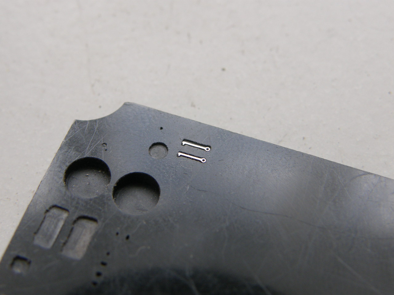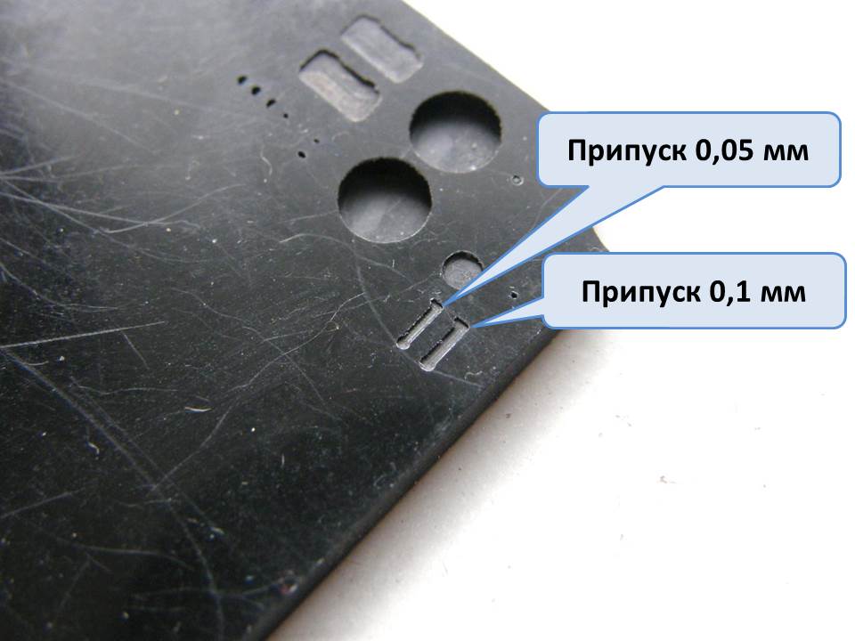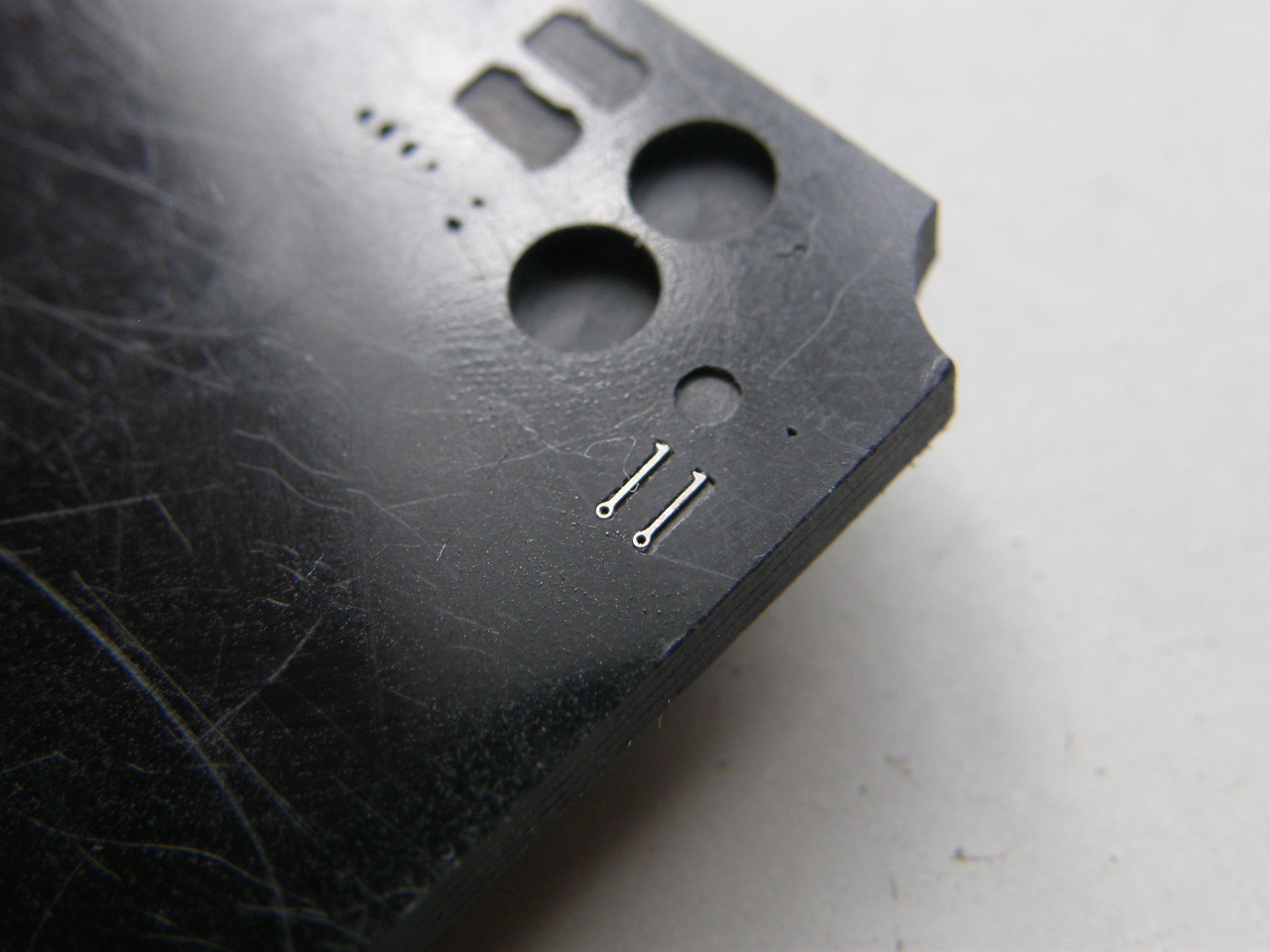Если лодки имели еще и резиновое противогидролокационное нерезонансное покрытие с рупорными каналами НППРК-4ДЗ толщиной 50 мм, то стойки леерного ограждения носовой надстройки укладывались в походном положении в специальные углубления, сделанные в резиновом покрытии. К этим лодкам относится и строящаяся мной модель Б-68 (К-68) проекта 651Э, имевшая по состоянию на 1986 год резиновое покрытие. Для отработки геометрии этих самых углублений в пластике толщиной 3 мм выгравировал углубления под 3 мм леерные стойки для линкора Ямато от Тамии, которые планирую устанавливать на модели. Сделал два углубления с припуском от геометрических размеров стойки на 0,1 и 0,05 мм на глубину 0,15 мм.