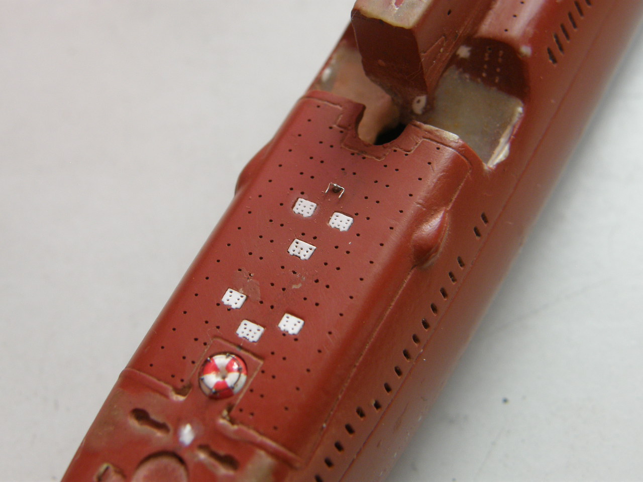 Сделал примерку на модели и тут выяснилось, что вырез в палубе надстройки для обслуживания передней крышки четвертого контейнера (левый борт) смещен на 0,5 мм к диаметральной плоскости.