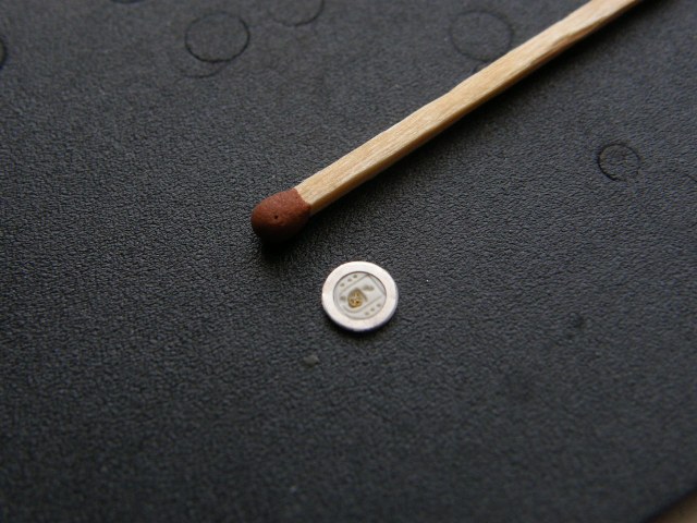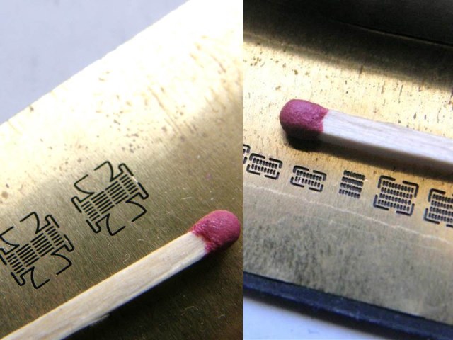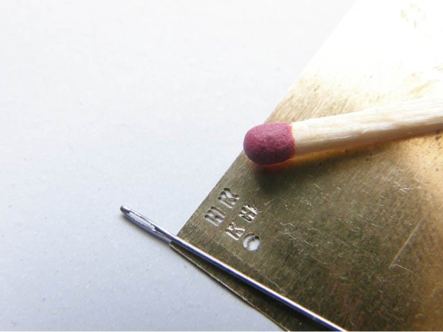На этот раз из латунной фольги толщиной 0,05 мм выгравировал буквы "Н" и "К" высотой 0,7 мм и шириной 0,5 мм. Для сравнения спички показалось мало, поэтому выложил иглу для бисера бисерную Ø 0,4 мм, игла не цыганская.