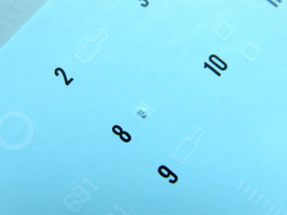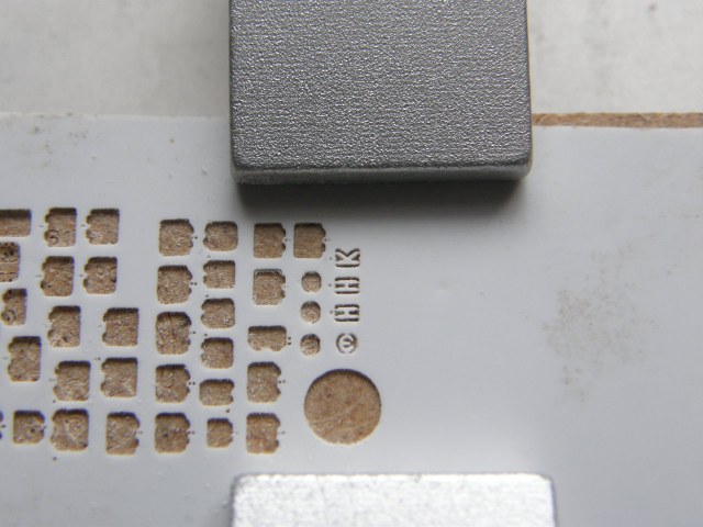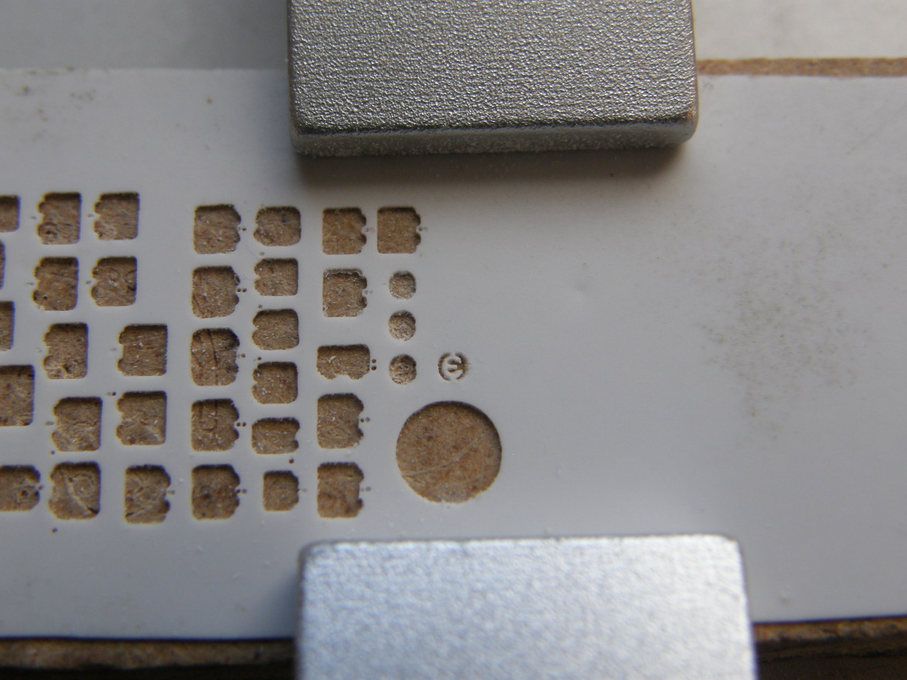 Из дошипласта толщиной 0,15 мм выгравировал букву "Э" высотой 0,9 мм и шириной 0,7 мм. Пробовал это сделать на оракале, но более мягкий оракал при таких размерах совершенно не держит форму, к тому же при толщине линии шрифта 0,15 мм клеящий слой оракала перестает работать.
