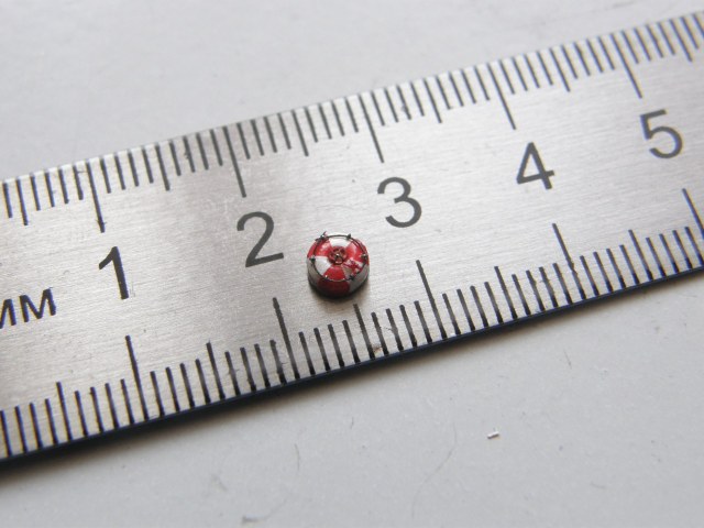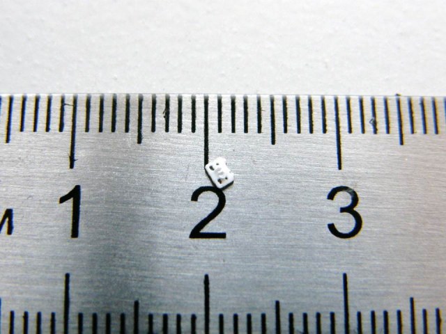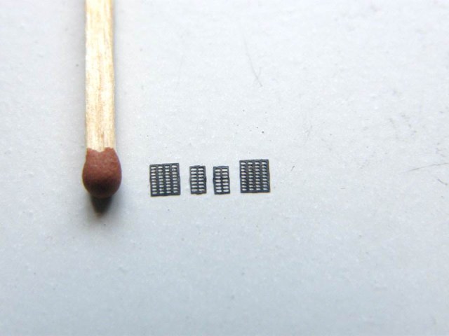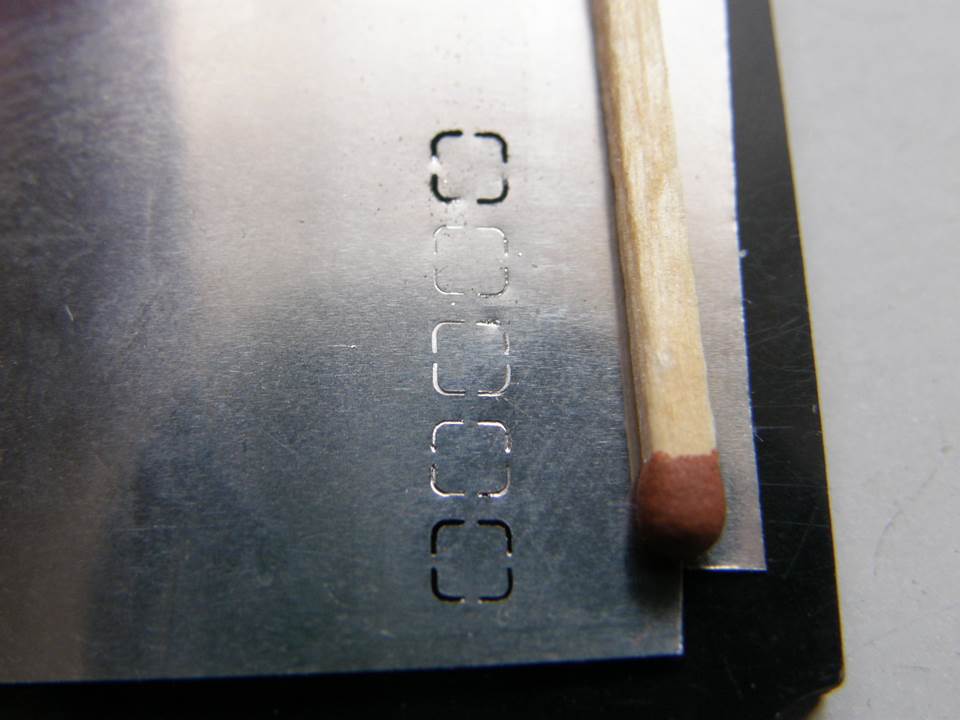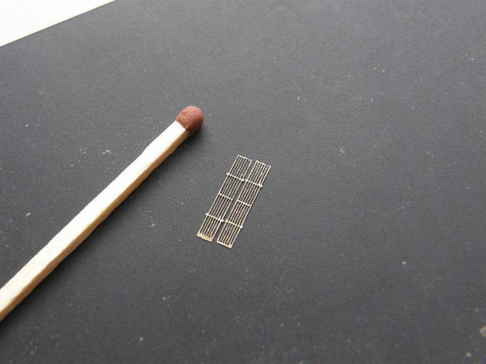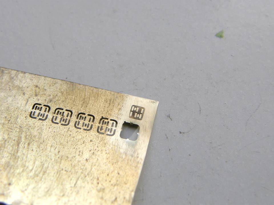 Из латунной фольги толщиной 0,05 мм выгравировал пять комплектов блока вибраторов на станке с ЧПУ (с учетом остальных не построенных моделей). Размеры блока вибраторов 1,8 на 1,8 мм.