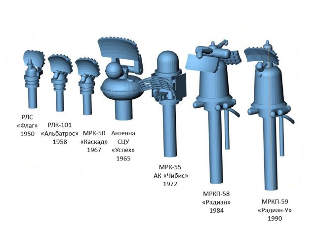 И в конце, используя все 3D-модели, показал историю советской радиолокации для подводных лодок с годами принятия их на вооружение. Все антенные посты выполнены в одном масштабе – 1/350.