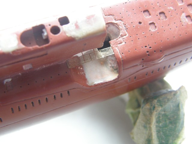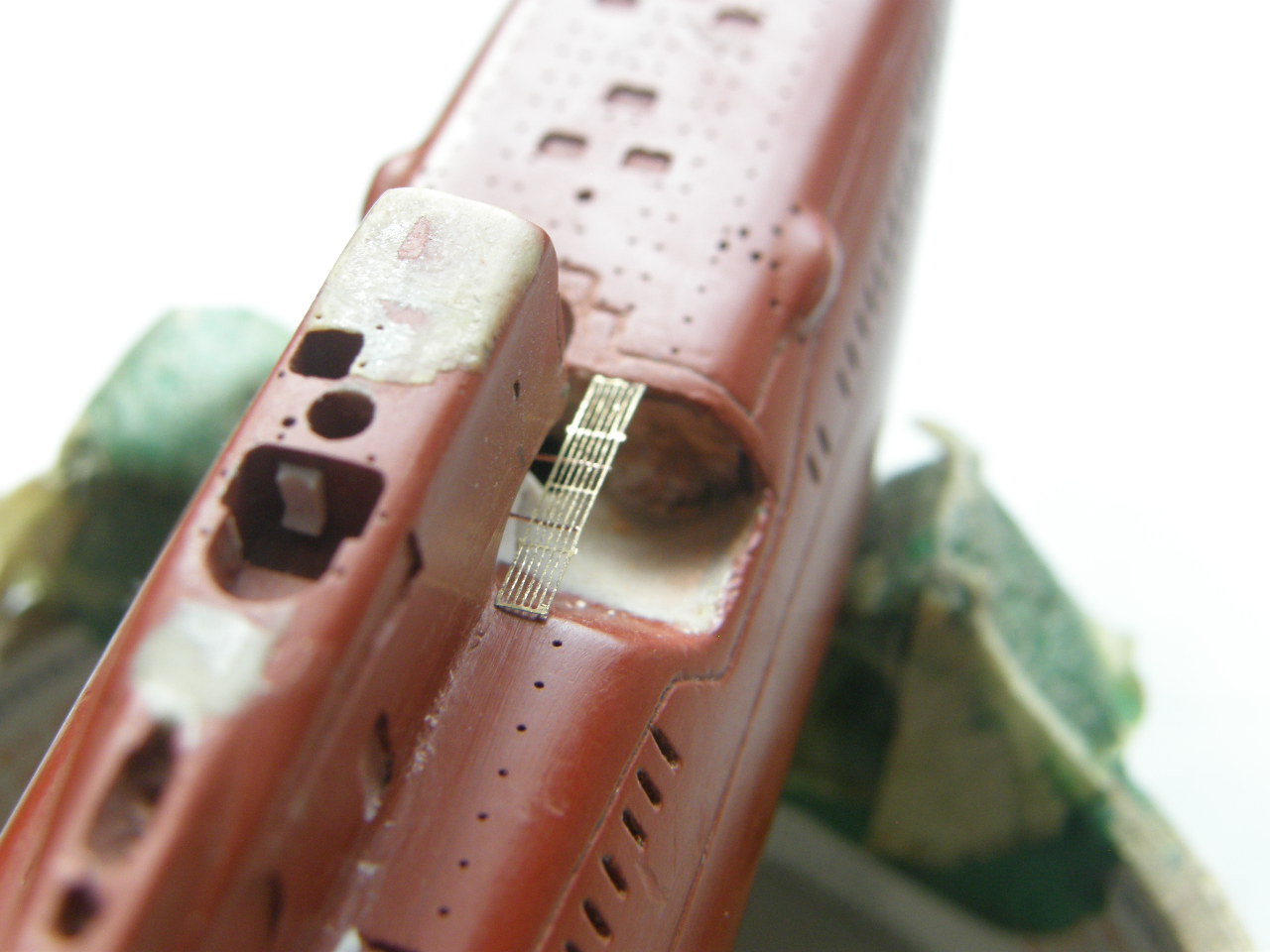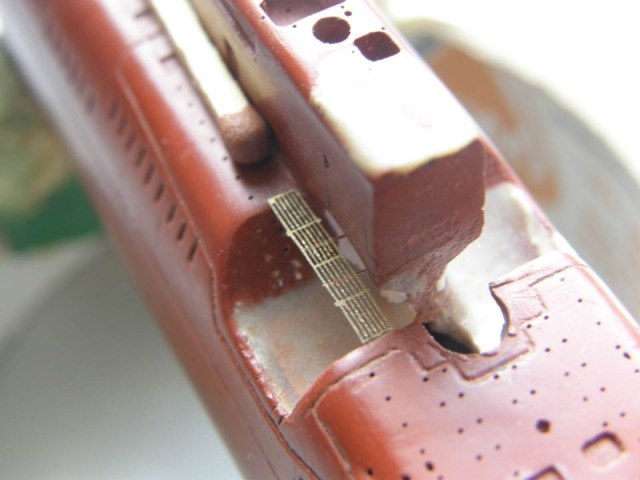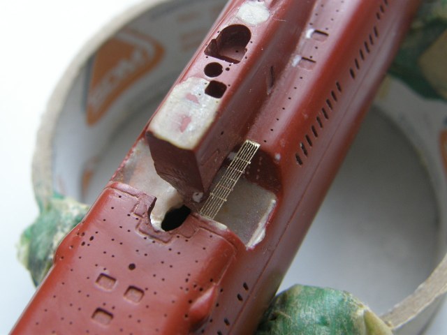 Пришлось вернуться к сеткам на выгородке системы общекорабельной вентиляции и трубопроводов газоотвода дизелей под РДП (работа дизелей под водой), расположенной в кормовой части ОР (ограждения рубки), изготовленным ранее (ссылка), пока они окончательно не окислились.