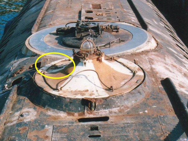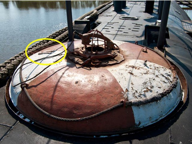[JUSTIFY]Продолжил баловство, Предметом баловства снова стали буквы, на этот раз "Н" и "К". Об аварийно-сигнальных буях (АСБ) и истории их развития уже было написано (ссылка). Буи с антенно-фидерным устройством, позволявшим обеспечить радиосвязь аварийной ПЛ, находящейся на грунте, с аварийно-спасательными силами на дистанции 10 - 15 км, как правило устанавливались на носовой надстройке. Для обозначения на один из красных секторов наносилась белая буква "Н" краской либо приваривалась, вырезанная из стали и окрашенная. При этом, буква располагалась так, чтобы она читалась из центра буя.