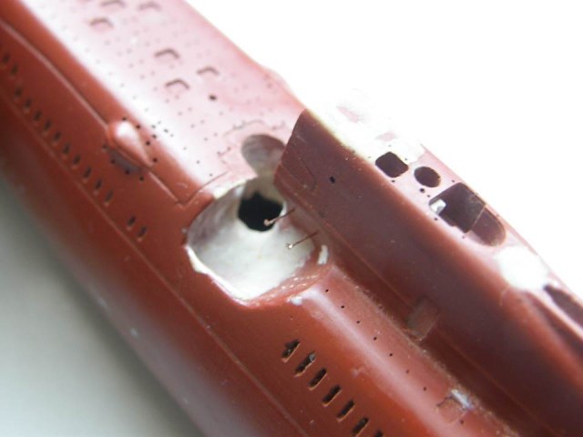 В килевой части корпуса модели отфрезеровал посадочное гнездо для корпуса блока вибраторов глубиной 0,1 мм.
