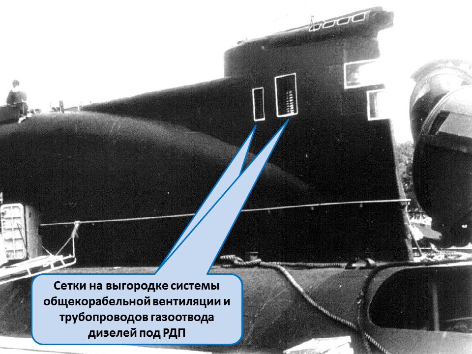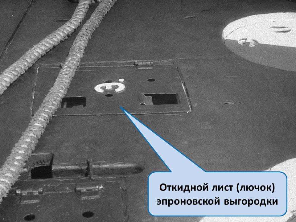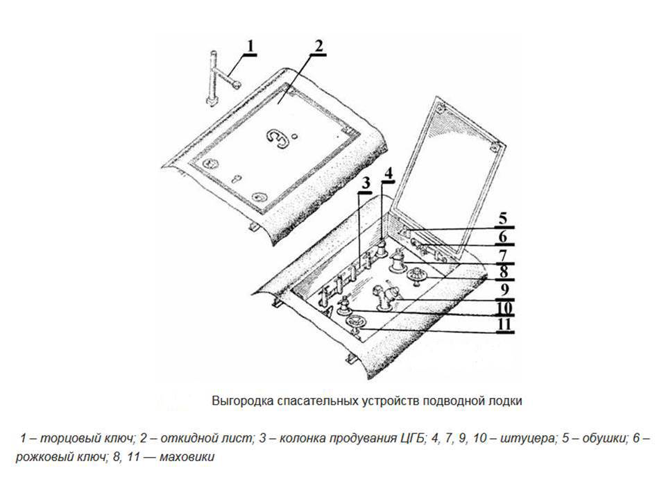 Один из вариантов эпроновской выгородки на подводной лодке показан на схеме. Вентиляция отсеков-убежищ (отсеки снабженные устройствами для выхода личного состава на поверхность) и подача воздуха для продувания ЦГБ производится через специальные выгородки, расположенные над этими отсеками. Выгородки аварийно-спасательных устройств размещены на палубе надстройки. Для облегчения их поиска на откидных листах (лючках) выгородок наварен традиционный отличительный знак “Э” (ЭПРОН).