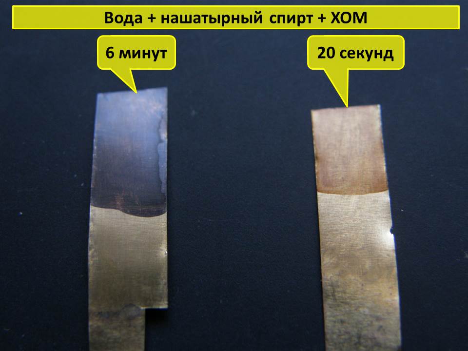 Не доверяя известным, а особенно неизвестным брендам жидкостей для чернения, чернение проводил в уже проверенном растворе (вода, нашатырный спирт и ХОМ (хлорокись меди)) в течение 20 минут. После чего, промывкой в мягкой воде остановил чернение и дал просохнуть не менее 2 часов, чтобы патина (в данном случае чернь) окончательно закрепилась.