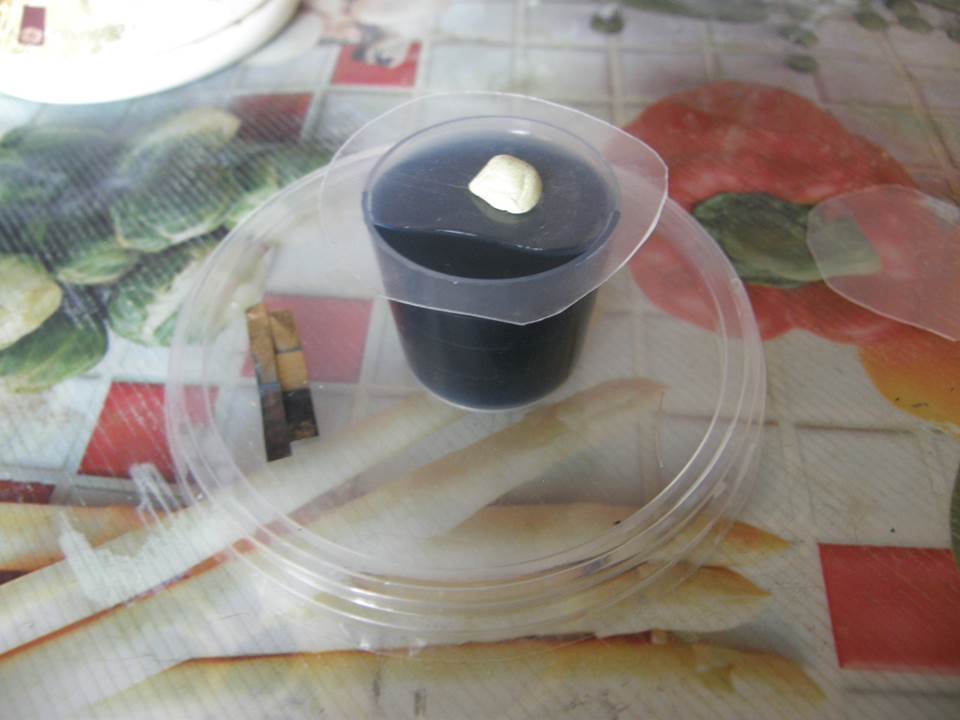 Далее нужно было латунь "превратить" в бронзу. Для получения цвета бронзы необходимо в растворе воды с нашатырным спиртом растворить ХОМ (хлорокись меди) и выдержать в нем изделие до 20 секунд. Если держать изделие (медь или латунь) от 6 минут и более (до 30 минут)  можно получить цвет черни с голубоватым отливом. Патина получается очень устойчивой, ее можно полировать и удалить только абразивом. Ранее в аналогичном растворе чернил защитные решетки для датчика МГ-23 ГИСЗ "Береста" (ссылка).