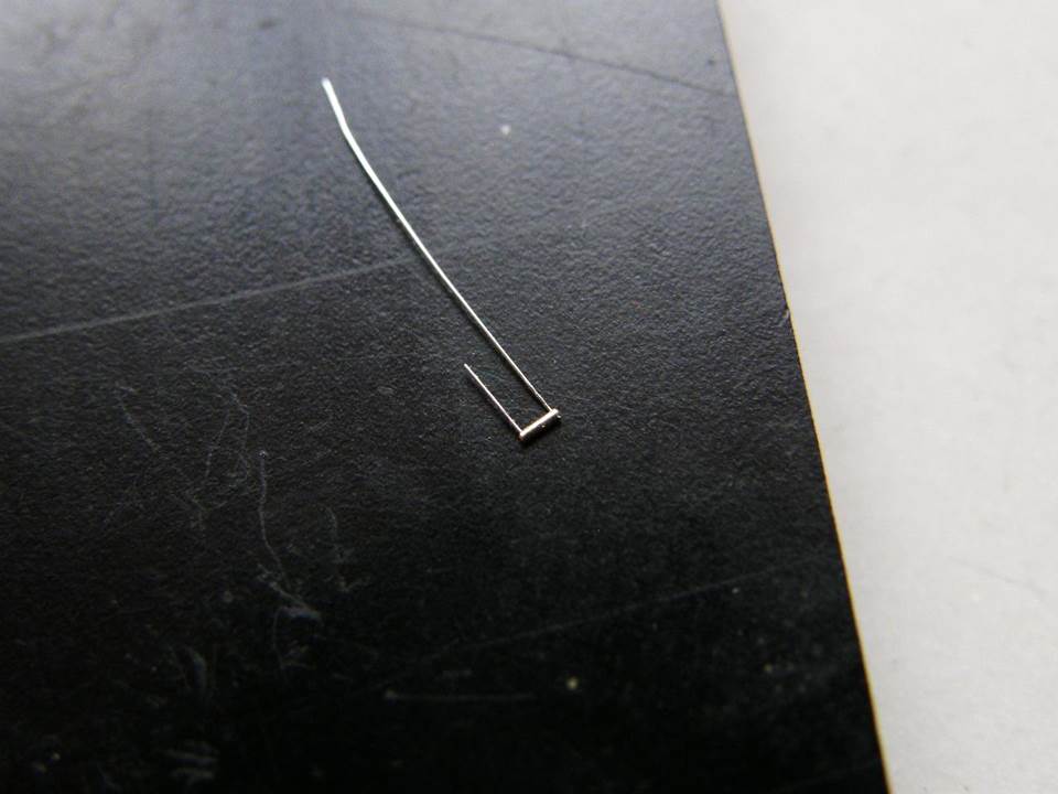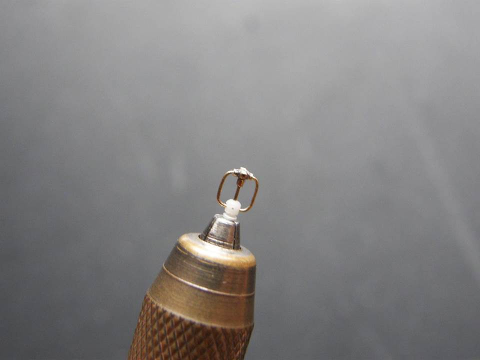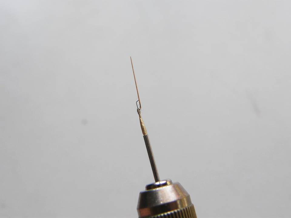 Из обрезка леера сделал хомут, обогнув его на проволоке Ø0,3 мм, и кончики вставил в отверстие трубки-основания. Тем белее, что хомут на фотографиях прототипа ярко выражен. Рога, выходящие из трубки, подогнул так, чтобы проволока была на расстоянии 0,1 мм от торца трубки.