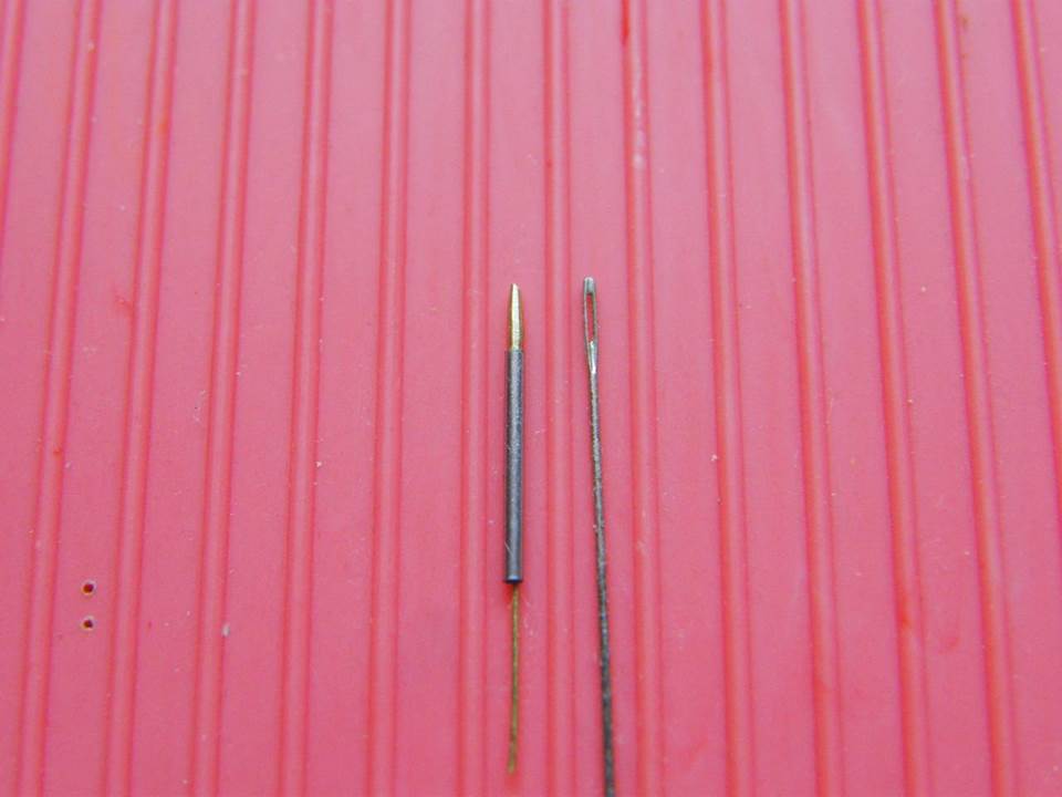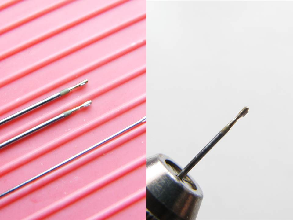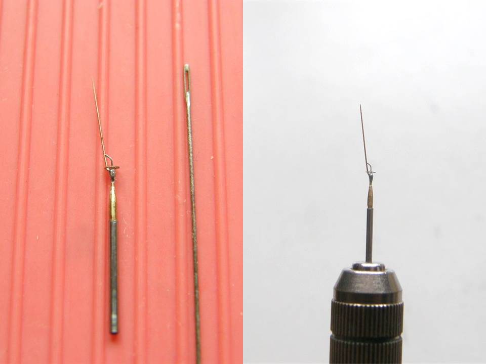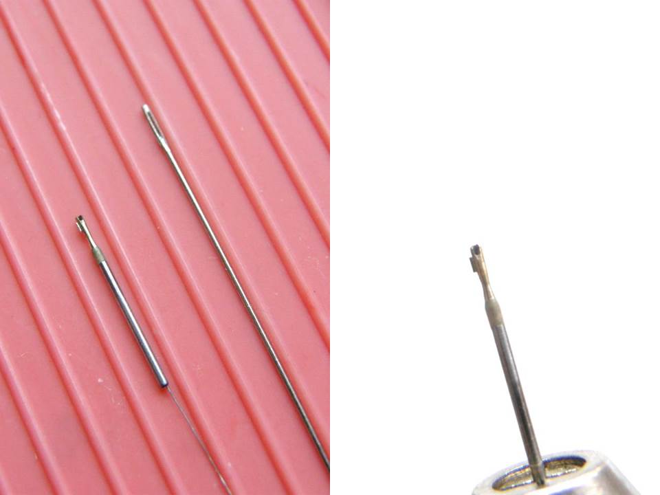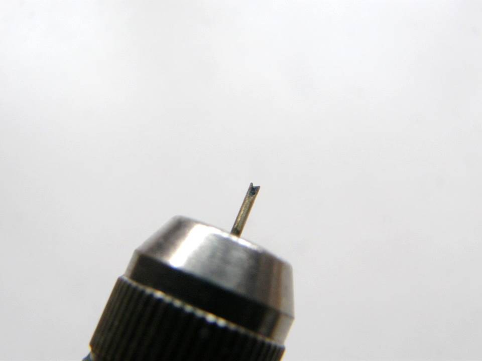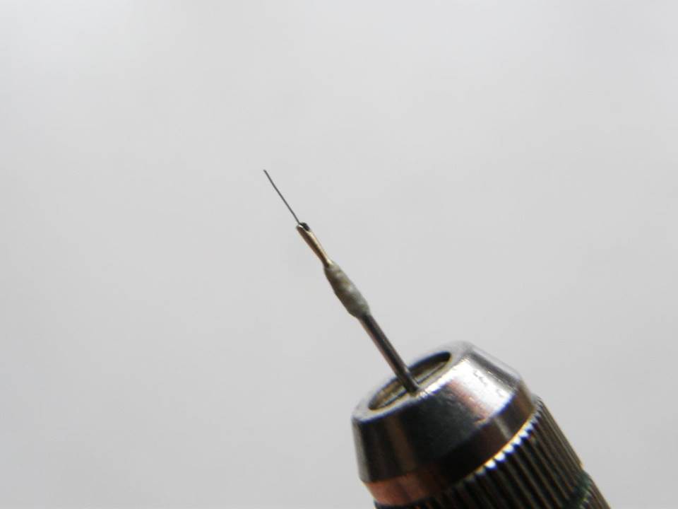 На бормашинке наждачной шкуркой зернистостью 800 сточил нижний край головной части перископа для установки ее в мачту перископа, сделанную из медицинской иглы Ø0,6 мм с внутренним диаметром 0,35 мм. Для установки верхнюю часть мачты из медицинской иглы высверлил сверлом Ø0,45 мм.