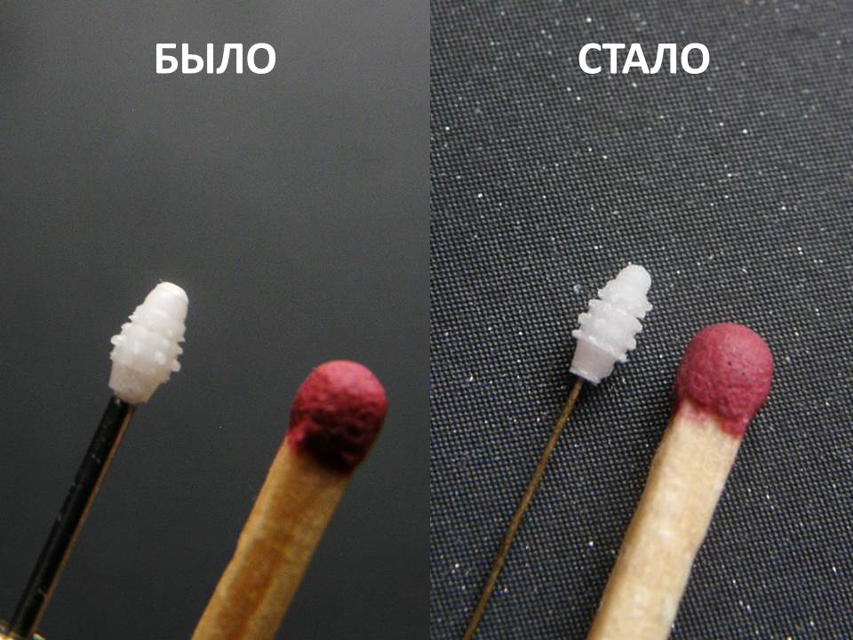 Зажав заготовку головной части в патроне бормашинки, наждачной шкуркой зернистостью 800 скруглил верхний торец головной части перископа и опять примерил оптоволокно.