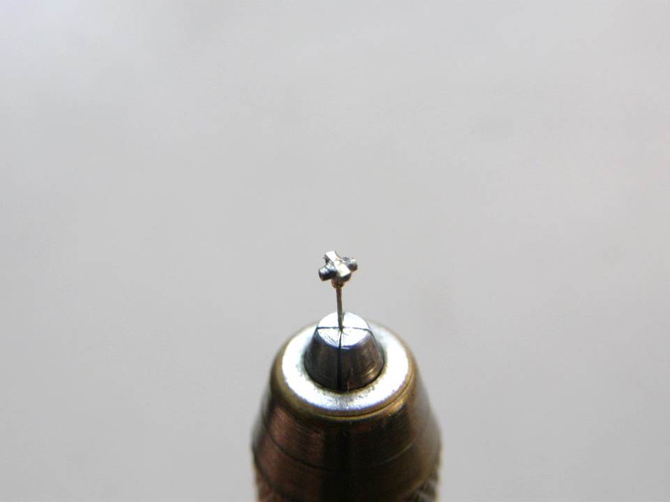 После полимеризации лака наждачной шкуркой зернистостью 800 заполировал верх крестовины, а заодно и проверил прочность всей конструкции. Полировку проводил на вращении, зажав крестовину в патроне бормашинки. Размер крестовины составил 1,4 на 1,4 мм по горизонтали и 0,9 мм по высоте.