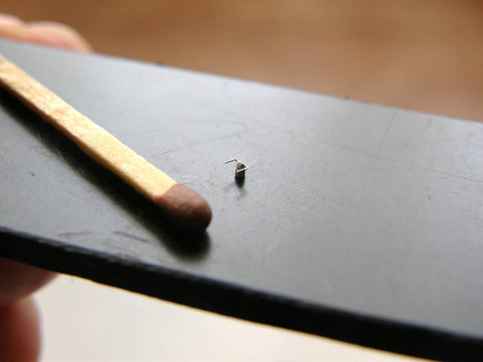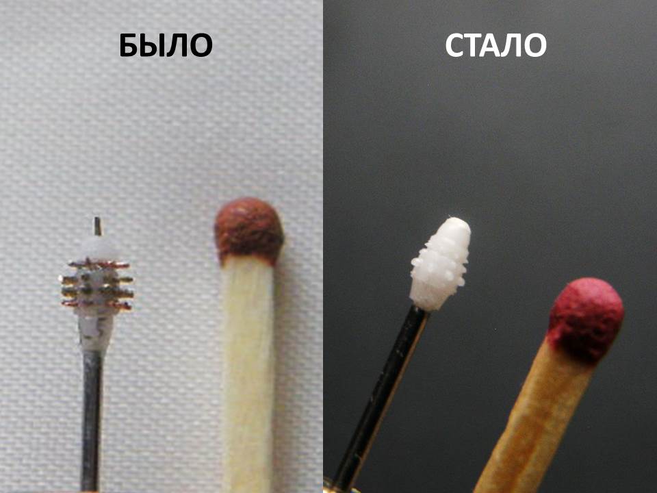 Вставил трубку с рогами в хомут. Окончательно обжал хомут пинцетом вокруг горизонтальной трубки с рогами и кончики хомута продернул в отверстие трубки-основания. На выходе получил датчик МГ-23 с габаритными размерами: ширина – 1,3 мм, длина – 1,2 мм, высота 1,2 мм.