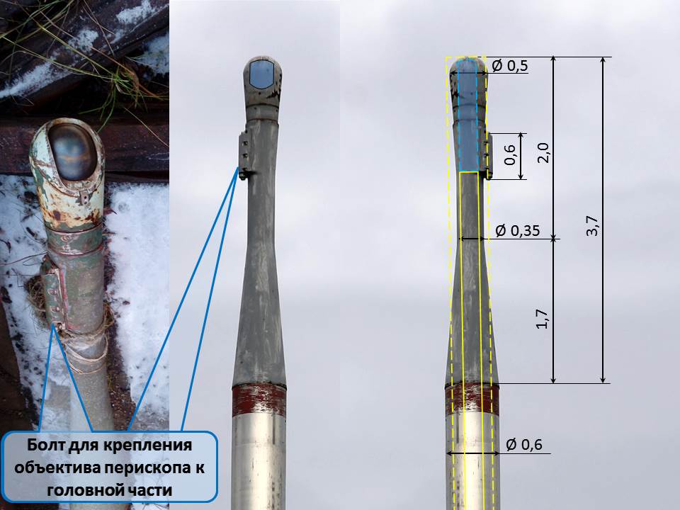 Продолжил работу с перископами. На это раз это перископ ПЗНА-10 (перископ зенитный навигационный атаки). Внешний вид головной части перископа ПЗНА-10 не отличается от головной части ПЗНГ-8.