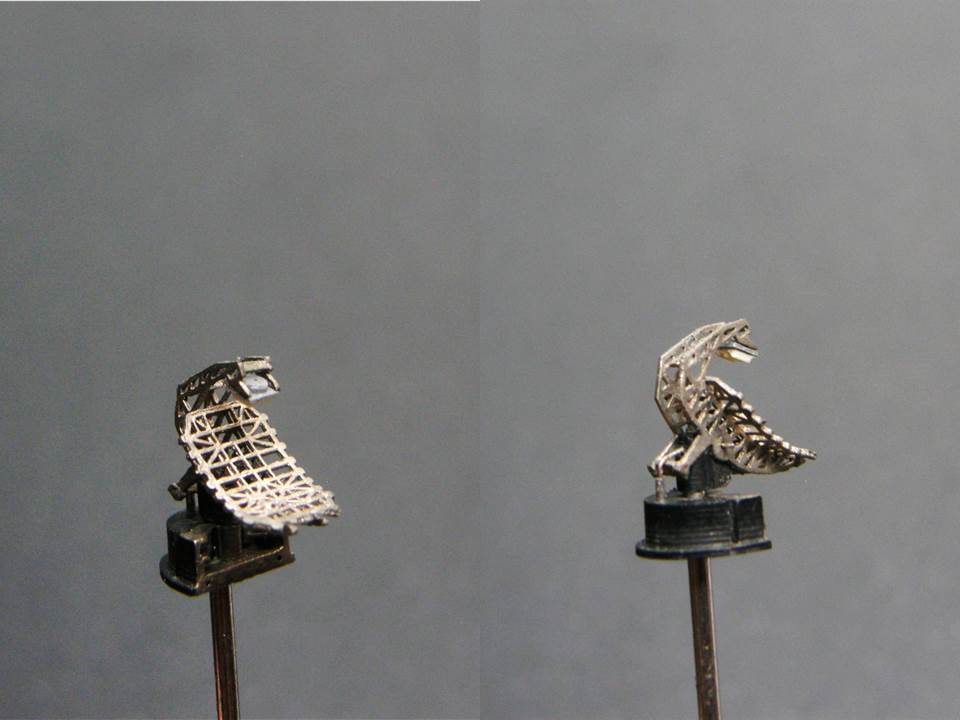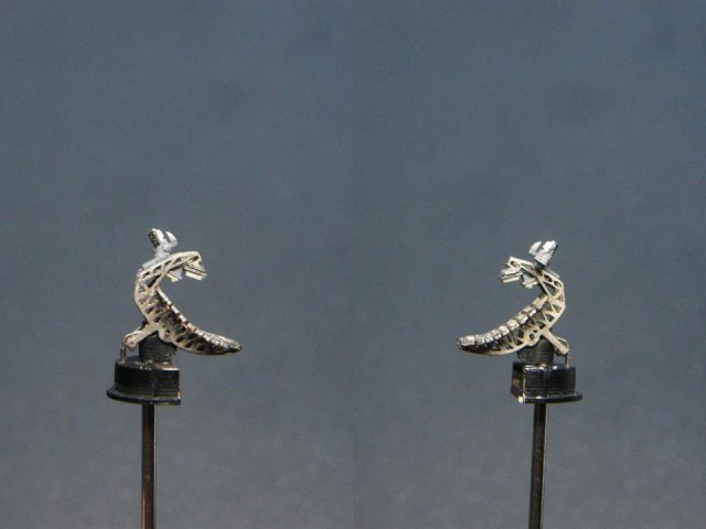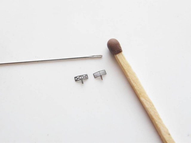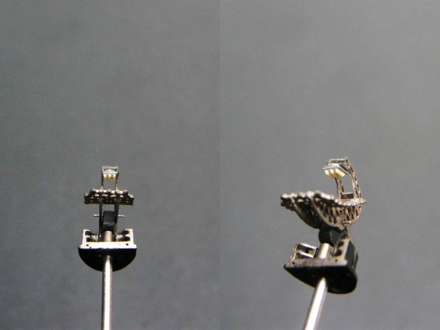 Комплект фототравления антенны был сделан ранее, три года назад (ссылка и ссылка). Фототравление секторной антенны в ГП извлек из заготовки и зачистил остатки перемычек наждачкой с зернистостью 2500 и слегка согнул, придав антенной решетке и ферме антенны параболическую форму. Конечно, фототравление сделано весьма условно, но более чем четыре промежутка между горизонтальными прутьями на решетке высотой 1,1 мм прорезать не удалось, толщина прута составила 0,05 мм. Для наглядности масштаба использовал спичку бытовую (не сигарную и не каминную) и иглу для вышивки Ø 0,4 мм (не цыганскую).