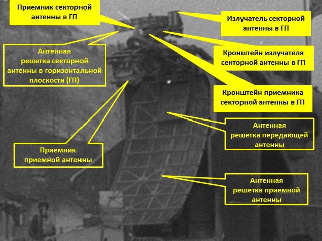 Довооружение антенны АП (антенного поста) "Аргумент" мелочевкой продолжается. Необходимо сделать примерку секторной антенны в горизонтальной плоскости (ГП) АП системы управления "Аргумент". Антенна состояла из антенной решетки, сваренной из прутьев, и фермы к которой она крепилась, также сваренной из прутьев. Все упомянутые элементы выделены желтым цветом.