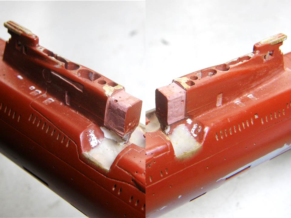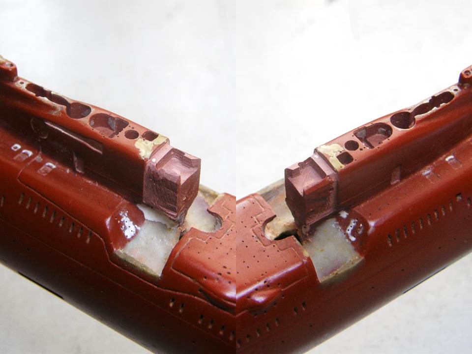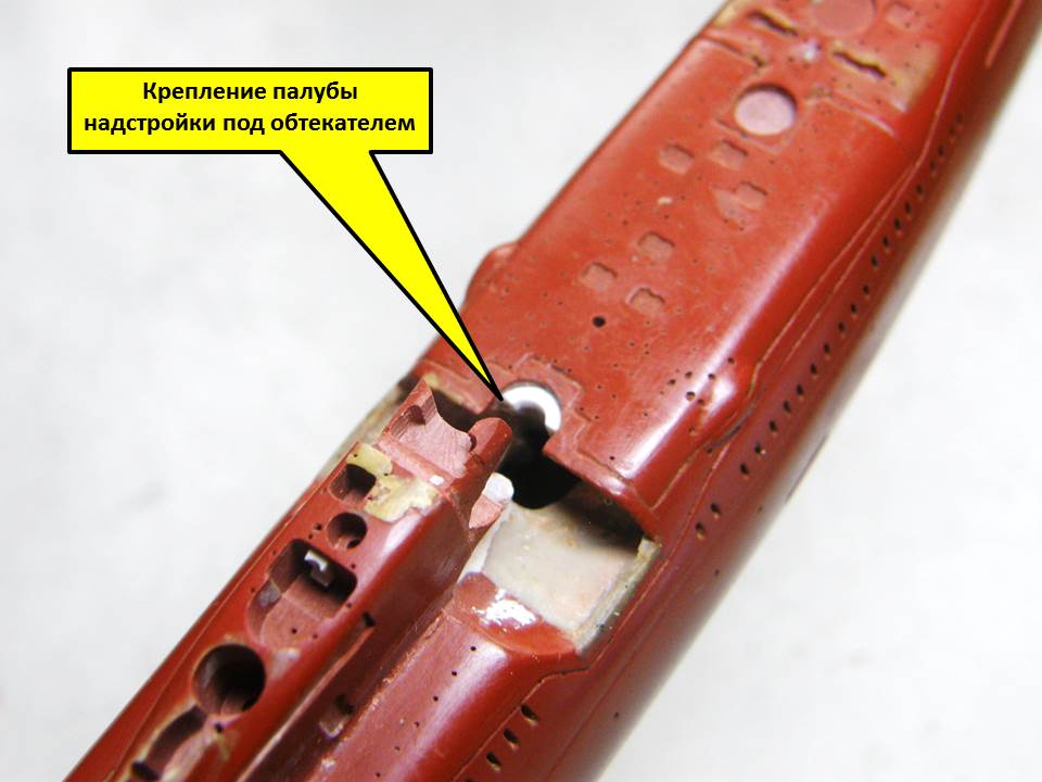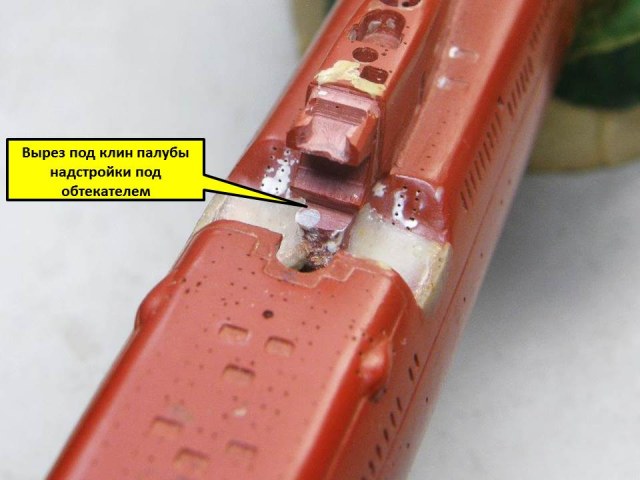 В нижней носовой части ОР (ограждения рубки) сделал вырез под клин палубы надстройки под обтекателем.