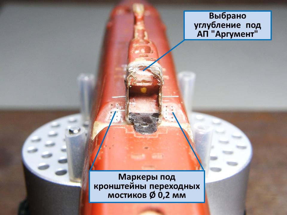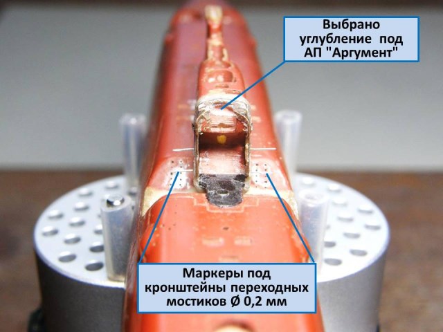 Сделал примерку обтекателя АП "Аргумент" и по результатам примерки бормашинкой выбрал углубление под АП "Аргумент". А также установил маркеры из проволоки Ø 0,2 мм серебристого цвета в отверстия под кронштейны переходных мостиков, изготовленных ранее (ссылка и ссылка).