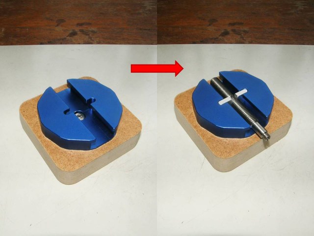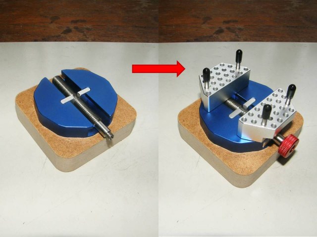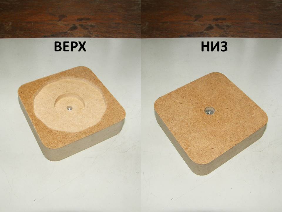 Для держателя тисков понадобился материал мягче алюминия, чтобы не испортить анодированное покрытие алюминия, из которого сделаны тиски, но в тоже время достаточно прочный, однородный и легко обрабатываемый. Выбор пал на МДФ  (древесноволокнистую плиту средней плотности). Из плиты МДФ  толщиной 19 мм отфрезеровал держатель, снизу которого в шестигранное углубление установил гайку М5.