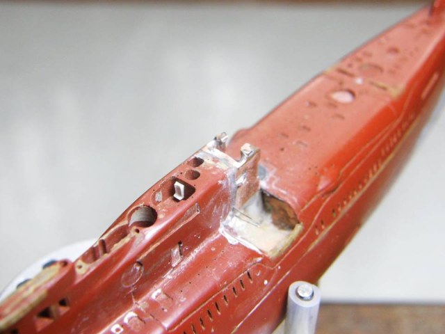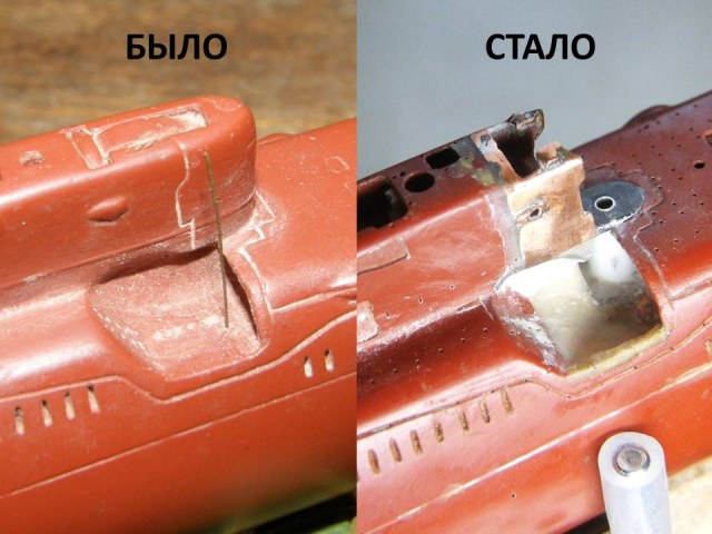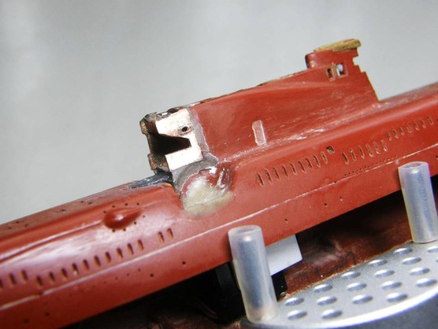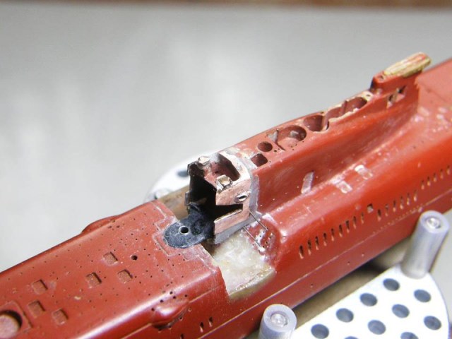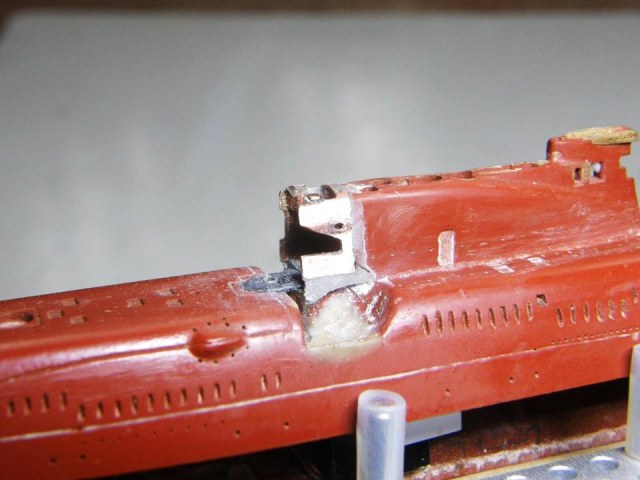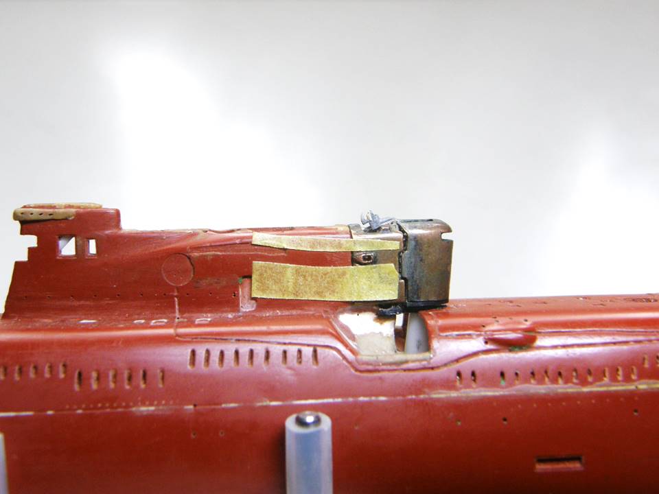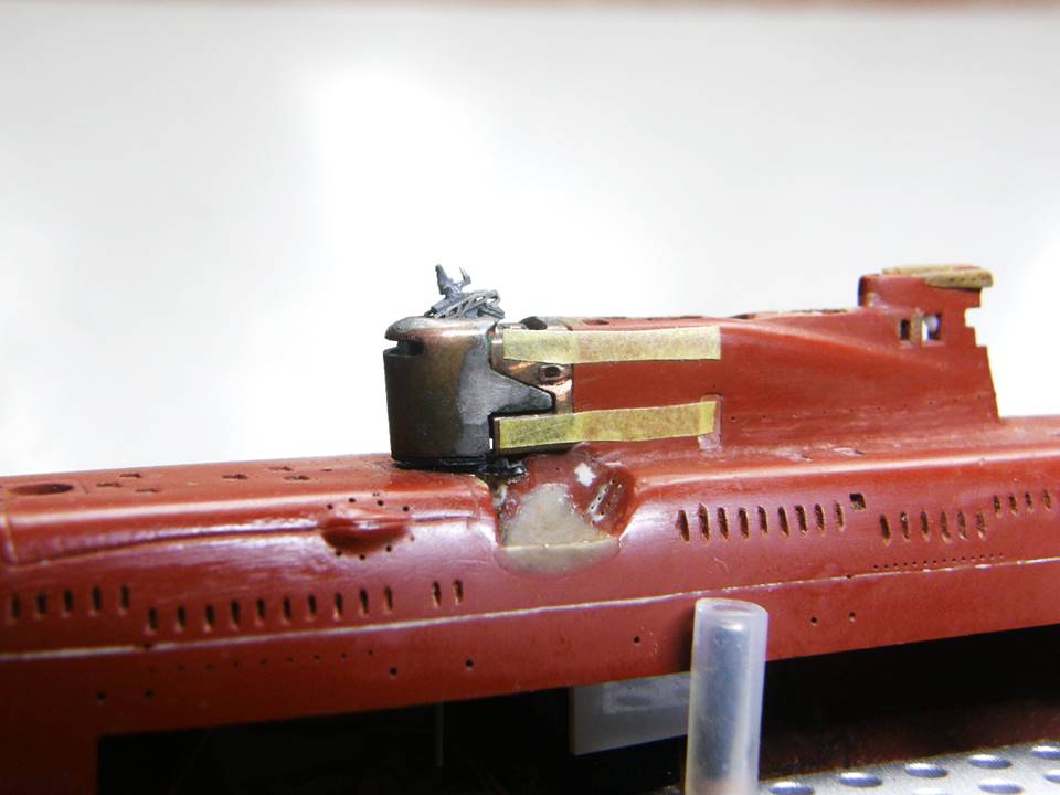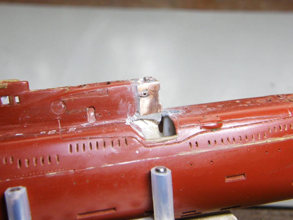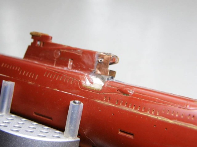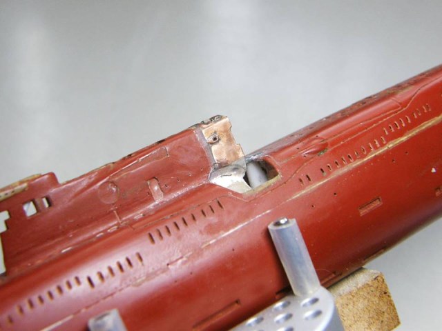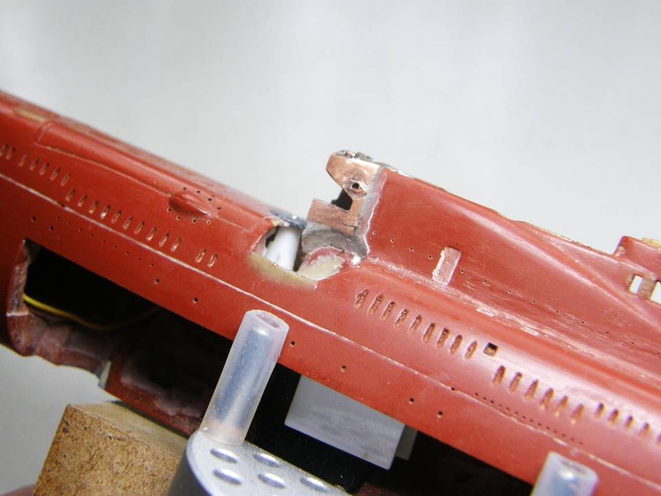 Поскольку интеграция участка сопряжения ОР (ограждения рубки) из гальванической меди в ОР прошла успешно начал постепенное восстановление связанных с этим участком элементов. Заново засверлил отверстия Ø 0,2 мм и глубиной 1,5 мм под носовые кронштейны переходных мостиков.