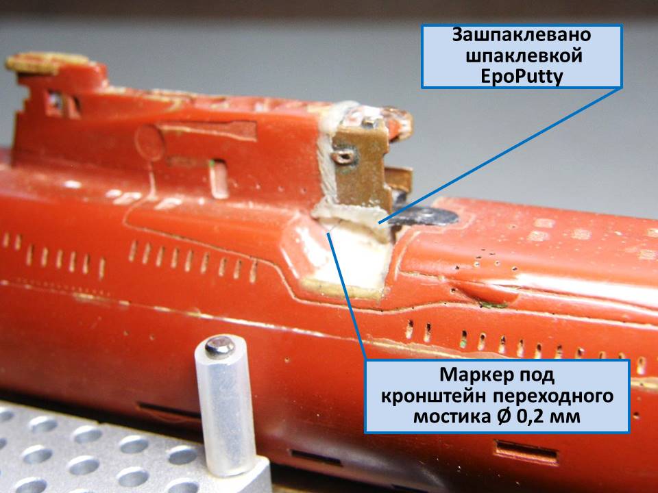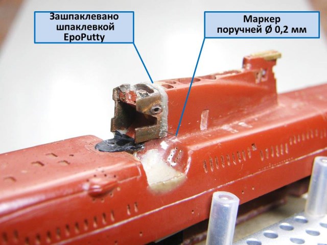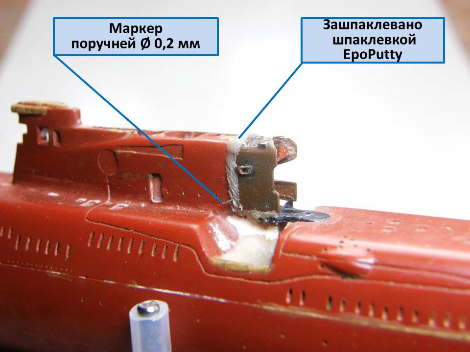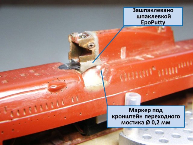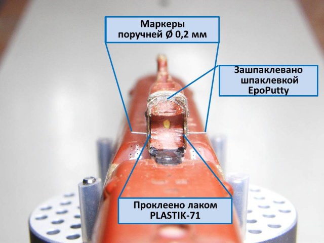 Теперь можно начать крепить участок сопряжения ОР (ограждения рубки) с обтекателем АП "Аргумент" с ОР. Лаком PLASTIK-71 пролил изнутри соединение участка сопряжения ОР с самим ограждением рубки. Через двое суток, после полимеризации лака, удалил временное крепление из скотча от Тамии, а внутренние пустоты между участком сопряжения и ограждением рубки зашпаклевал эпоксидной шпаклевкой EcoPutty. И в конце установил маркеры из проволоки Ø 0,2 мм серебристого цвета в отверстия под поручни.