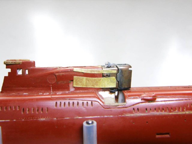 Продолжение восстановления связанных с участком сопряжения ОР (ограждения рубки) из гальванической меди элементов. На этот раз – поручней на носовой части ОР изготовленных ранее (ссылка). Для установки (примерки) поручней сделал по два сквозных отверстия с каждого борта Ø 0,2 мм в участке сопряжения ОР, остальные отверстия в ОР были сделаны ранее. И без клея примерил поручни.