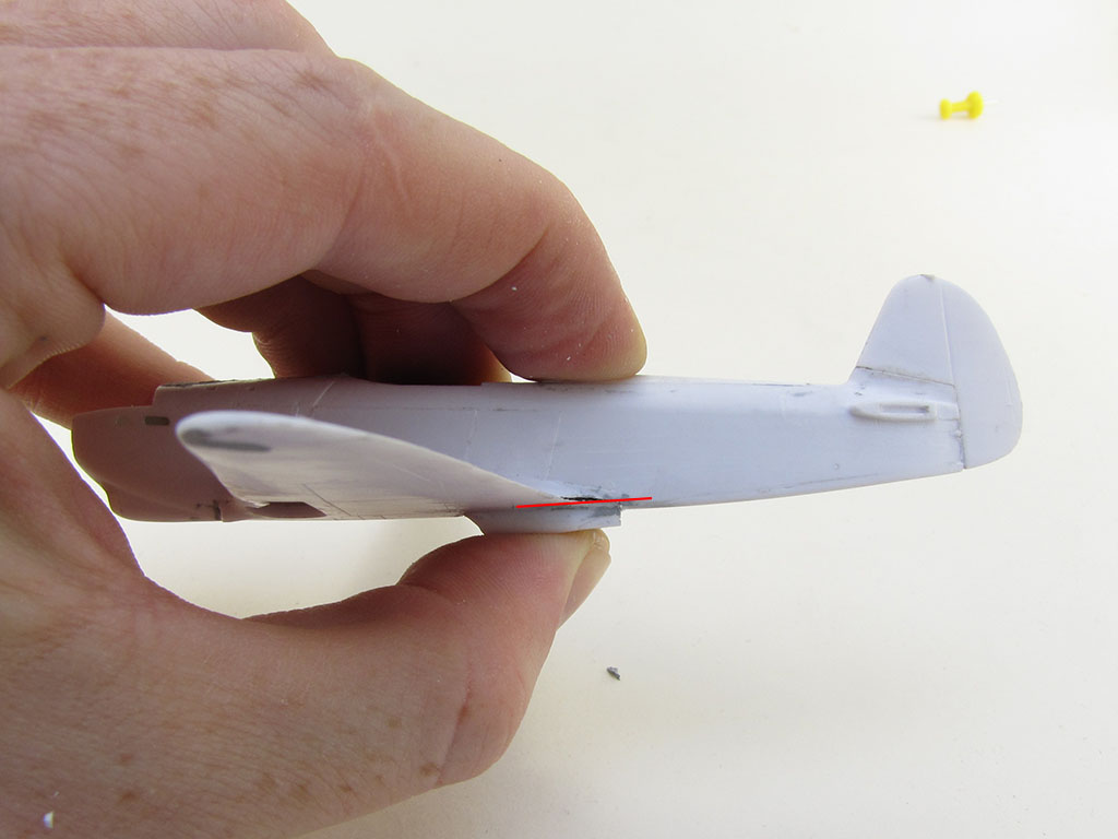 А потом решил заняться крылом... и вот тут, как говорилось в старых сказках, пришла беда откуда не ждали... Когда я сточил кромки (а точить там было примерно 1,5 мм в сумме), то не обратил особого внимания, что задняя нижняя часть крыла слегка утоплена. Типа фигя, зашпаклюю. Ага, счаззз! Оказывается ушел установочный угол крыла и там получилась не то что ступенька, там кратер, начинающийся от входа водорадиатора и полное несовпадение задней кромки крыла с тем, что должно быть (указано красной линией). В итоге пришлось крыло почти полностью отрезать и выставлять как надо. А вот теперь надо заклеивать получившиеся 1,5 мм щели и полностью выводить заднюю часть зализа. Одно хорошо- А-Модел эту часть сделал слишком маленькой, и ее все равно пришлось бы доводить до ума.