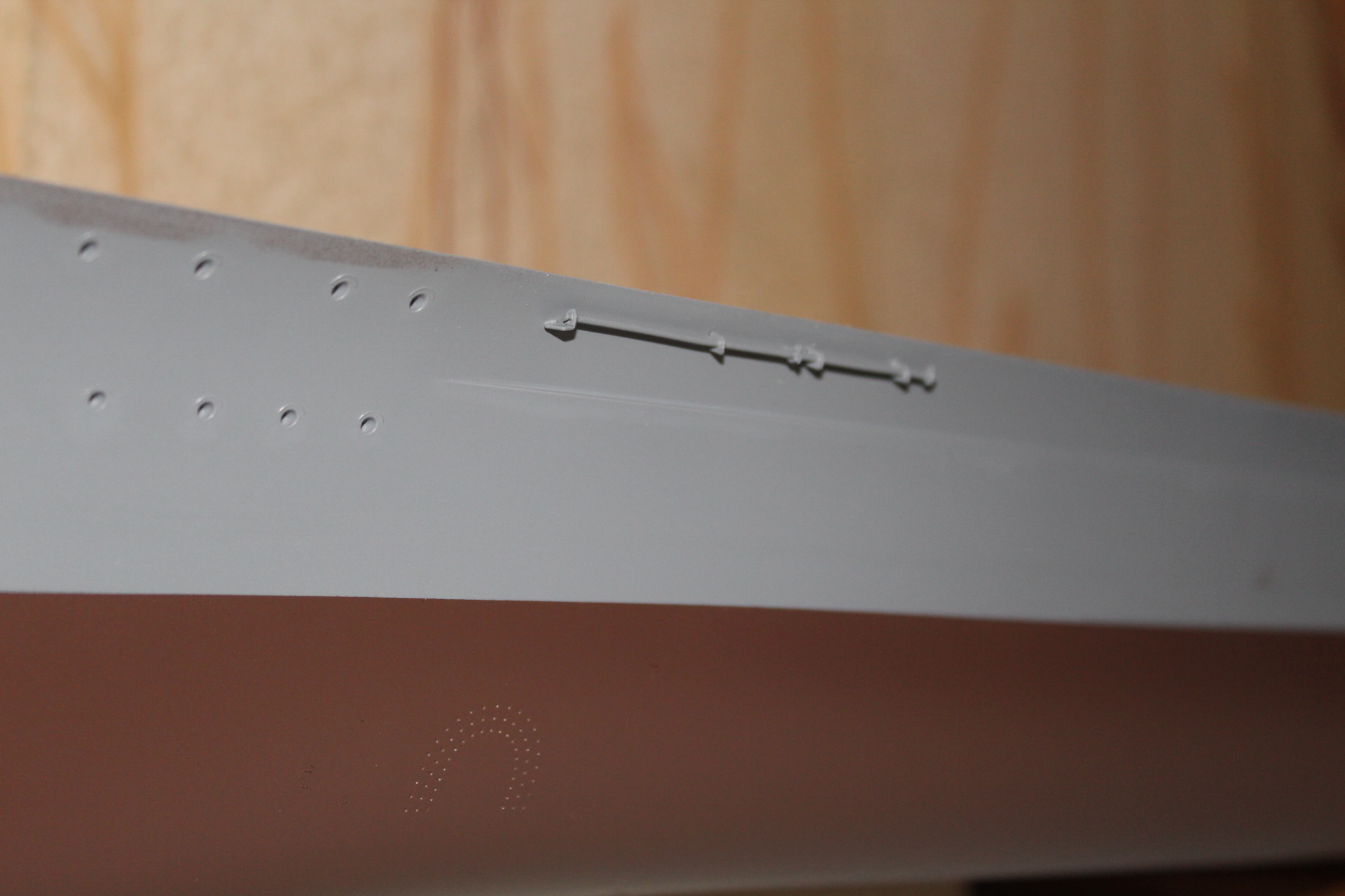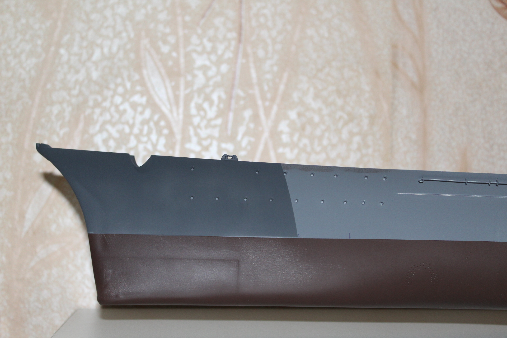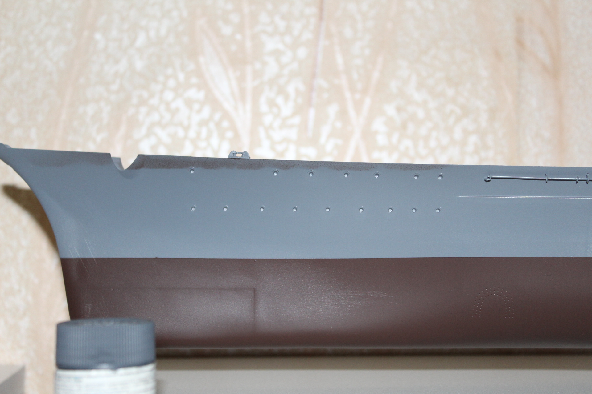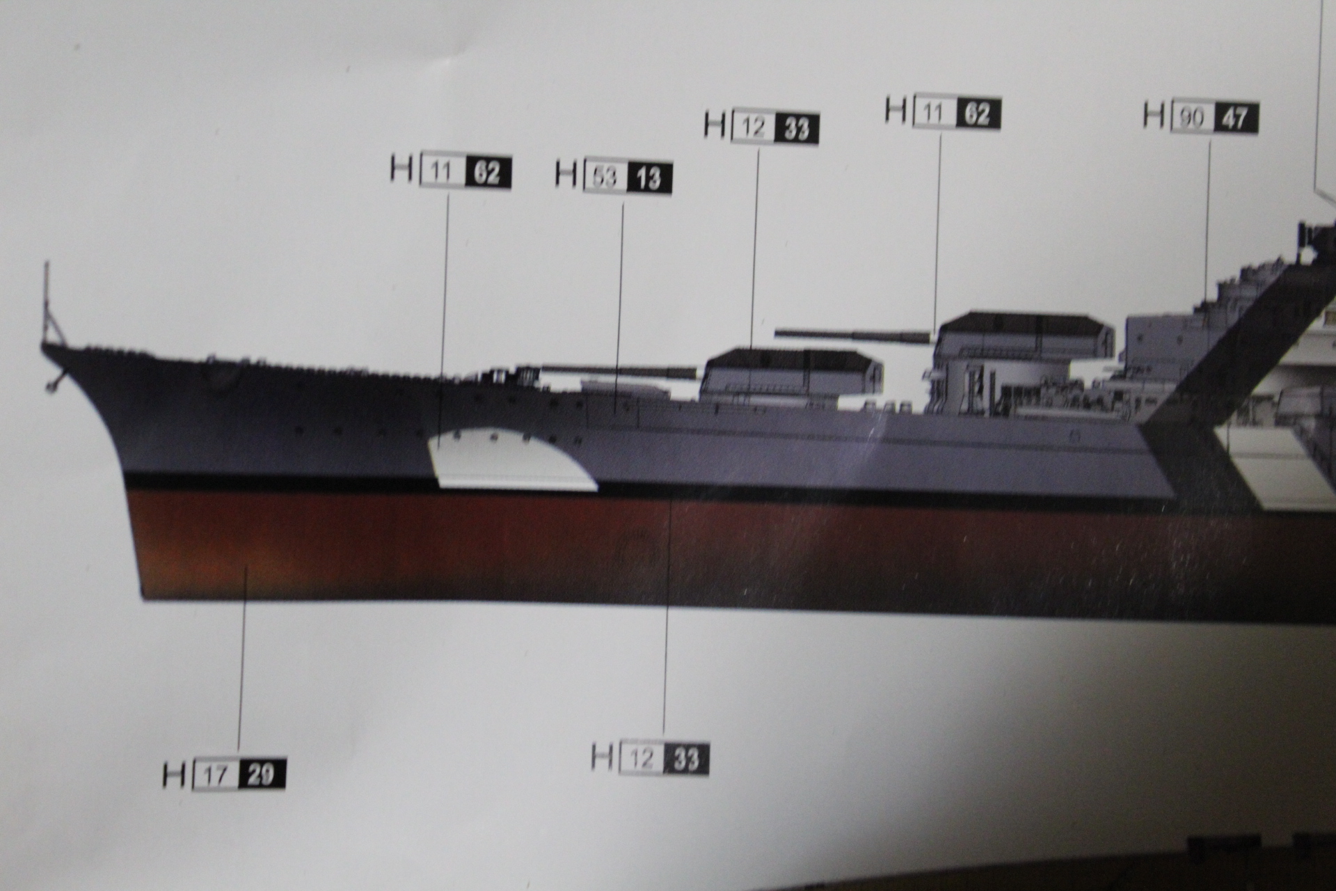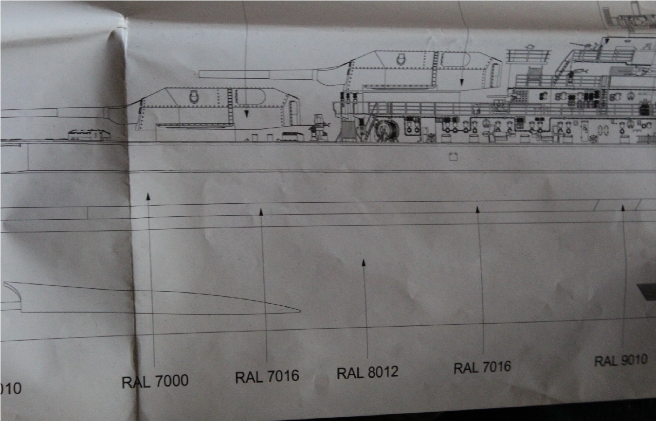 Теперь о покраске ,тук как выяснилось своя ,,веселуха,, трумпетер предлагает борта Neitral Gray , низ Cocoa Brown , теперь к таблице приложенной к бисмарку от амати там цвета RAL из которых получается борта -серая белка , подводная часть красно коричневая , красить решил модельной краской в баллонах фирмы Mr.Hobby ,в случае верха была выбрана краска - Neitral Gray, в подводной части красно коричневая (что и стало ошибкой) ибо красно коричневая уходит в коричневый оттенок , выбрал другой оттенок красновато коричневый он более в красный уходит ,заказал ,пока жду посылку с оставшимся красками ,занимаюсь выравниванием бульба