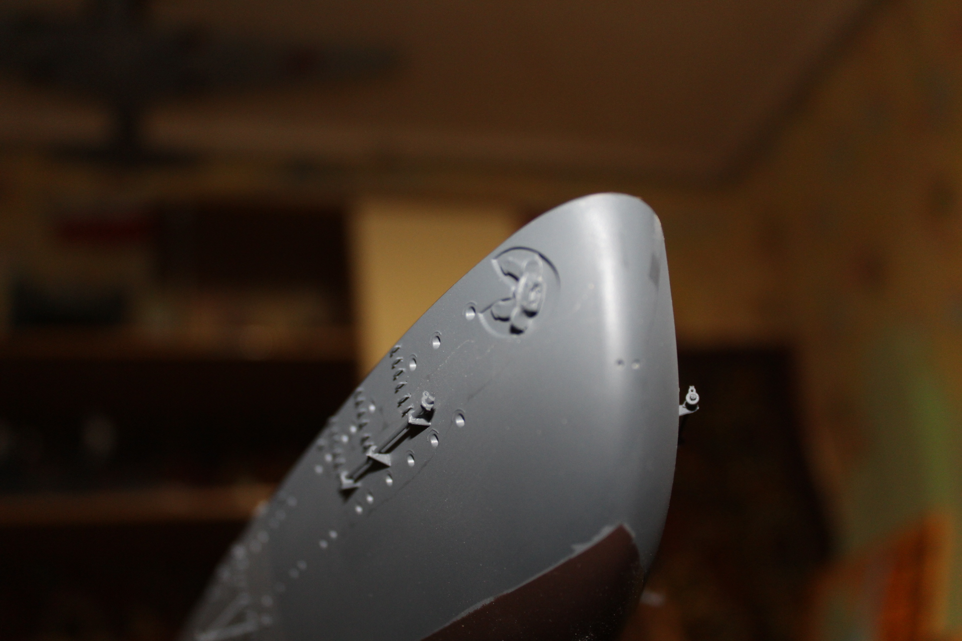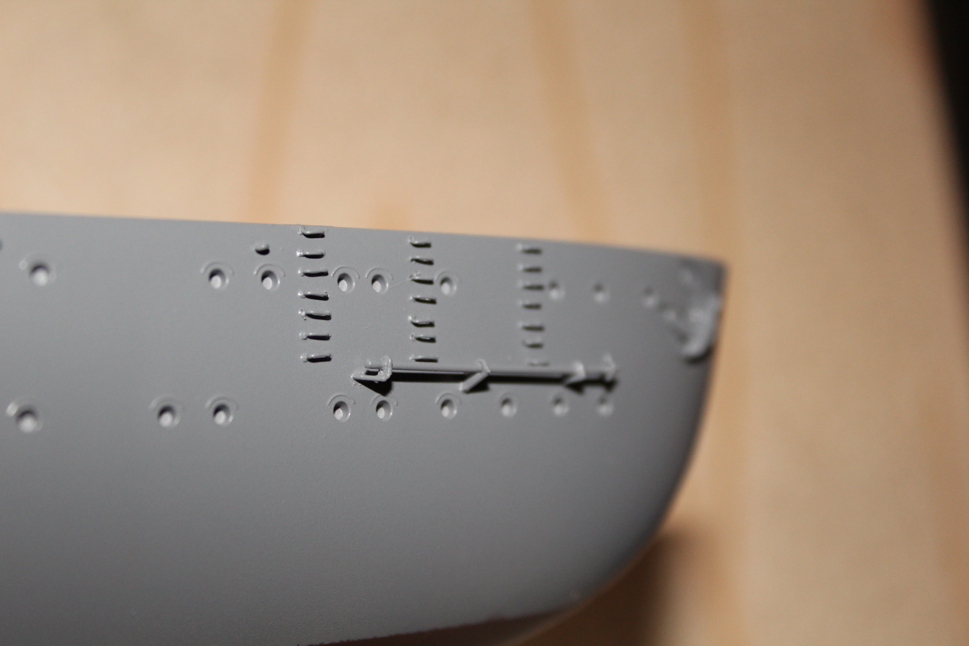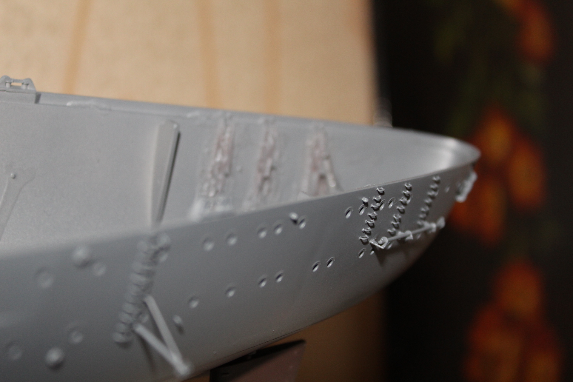 Добрый день . Решил скрестить Бисмарк от фирмы трумпетер с Бисмарком от амати (последний был разрушен мамой во время ремонта ) , при сборке корпуса Бисмарка от трумпетера возникла проблема с бульбом после покраски это вскрылось ,после замечания коллег наложил 6 слоев шпатлевки от фирмы Revell ,изготовил скобы на корме из провода трансформатора , с Бисмарка амати снял рымы для тросов и выстрелы на корме и носу ,из проволоки изготовил защиту винтов ибо у Бисмарка Амати они плоские , а у Трумпетера их вообще нет ,просверлил в корме отверстия под дымовую защиту .
