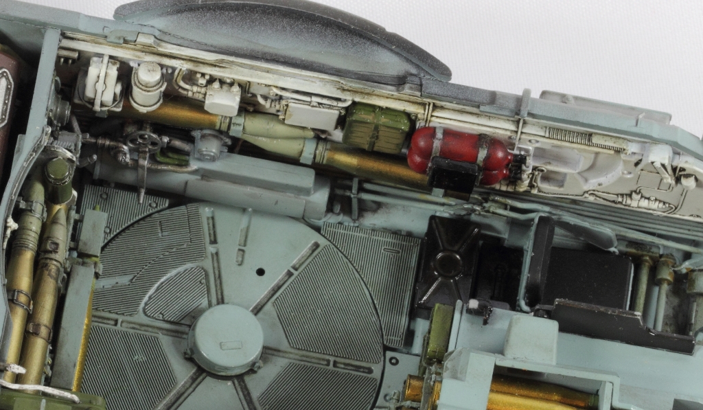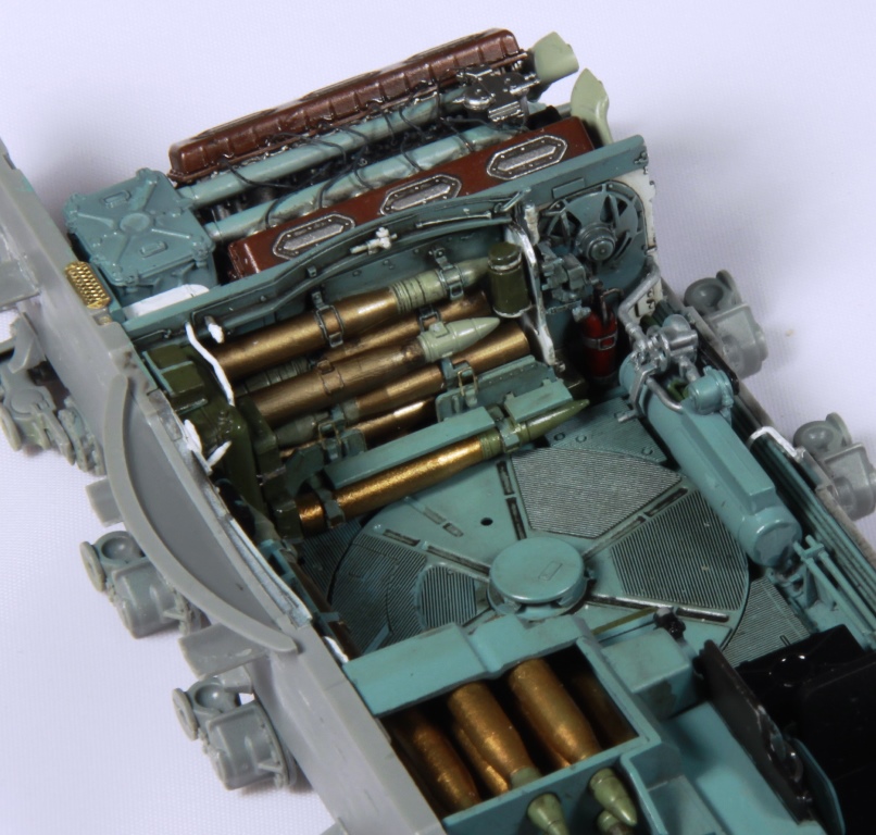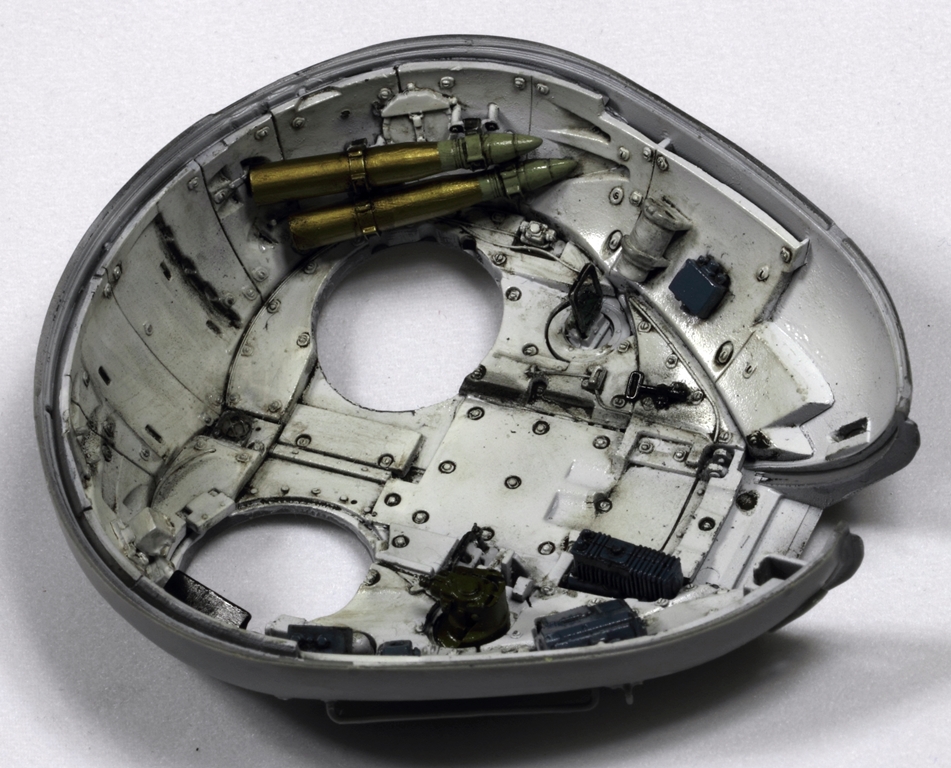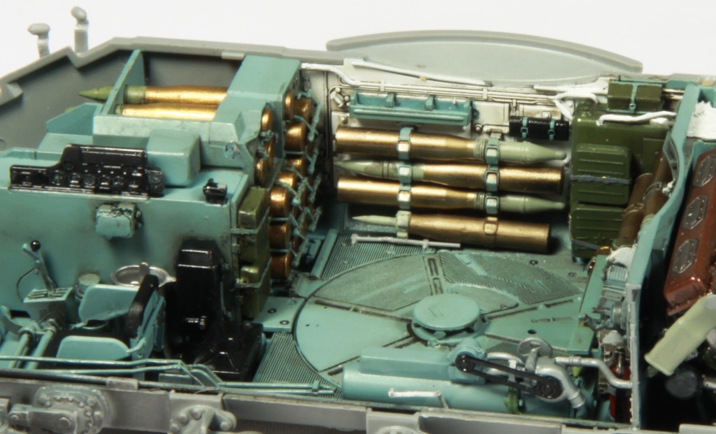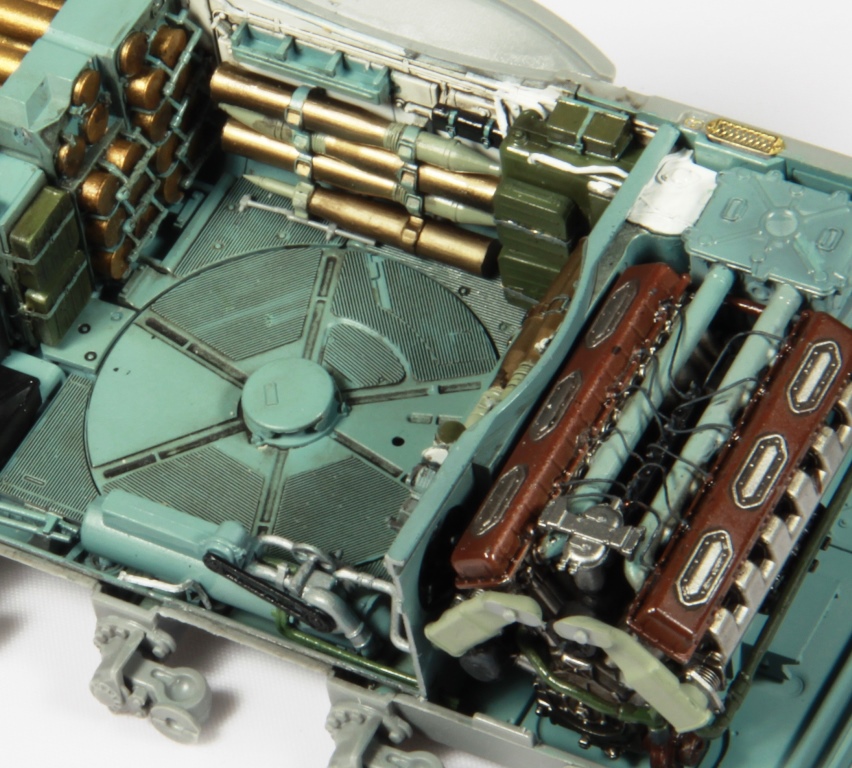 Здорово получается, я все никак не созрею на модель с интерьером. Хотя валяется СУ-85 от этой же фирмы. И да, пока не закрыли крышу башни. Два снаряда на башне, крепления бы подкрасить. Выделил красным.