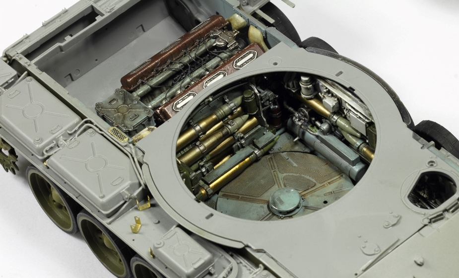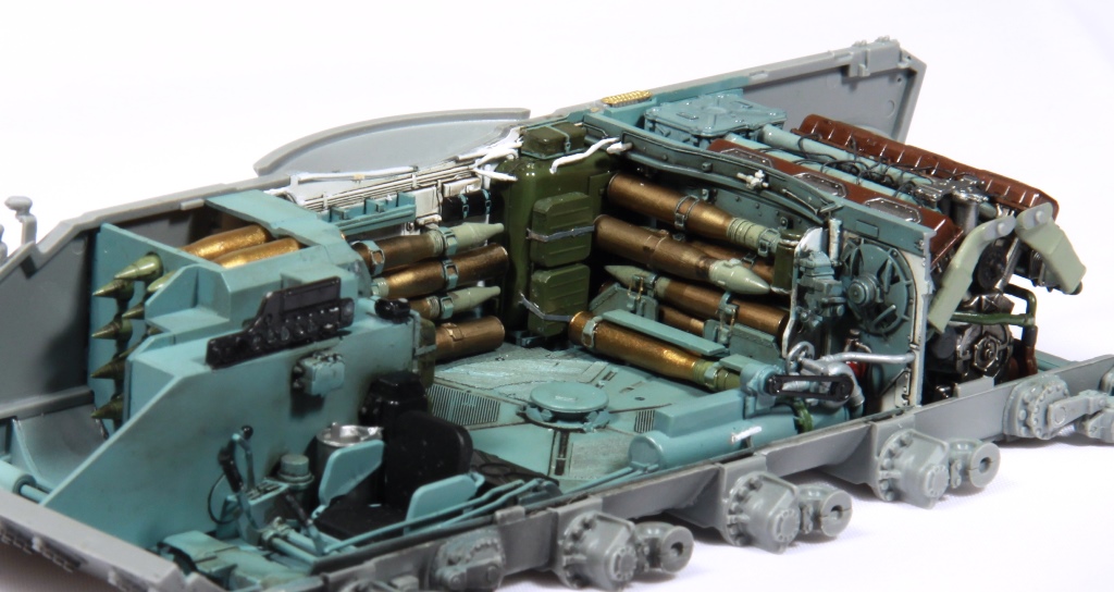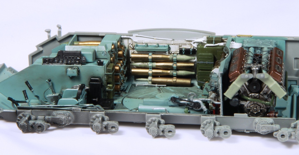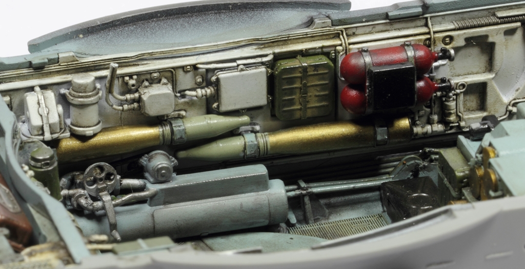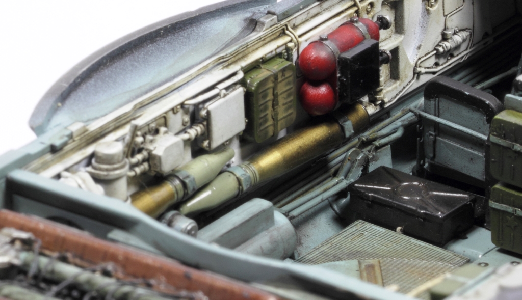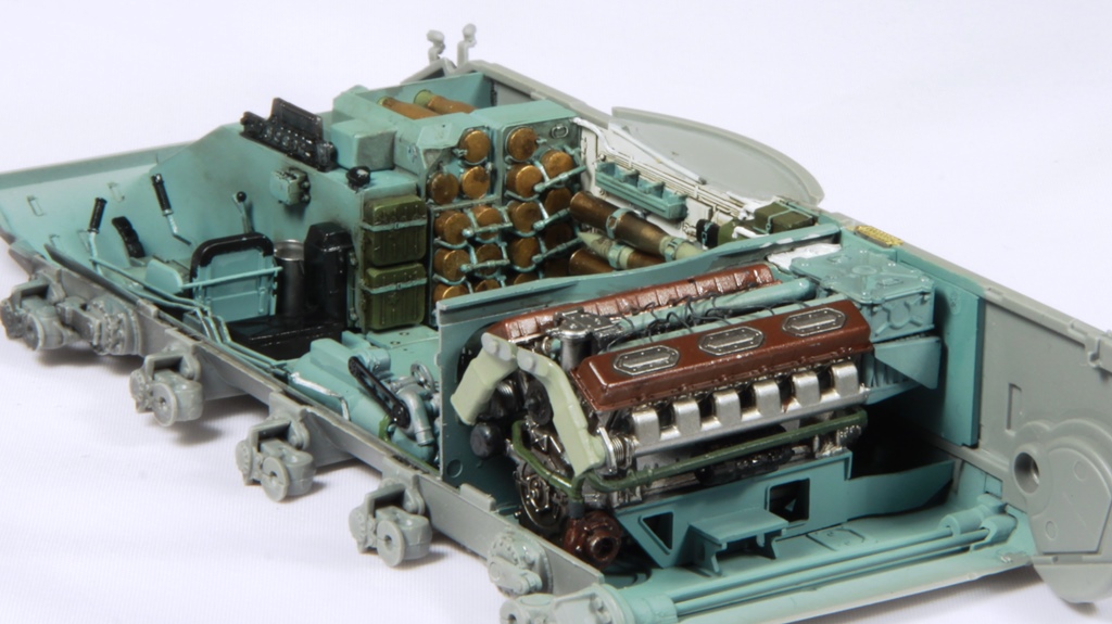 Здорово получается, я все никак не созрею на модель с интерьером. Хотя валяется СУ-85 от этой же фирмы. И да, пока не закрыли крышу башни. Два снаряда на башне, крепления бы подкрасить. Выделил красным.