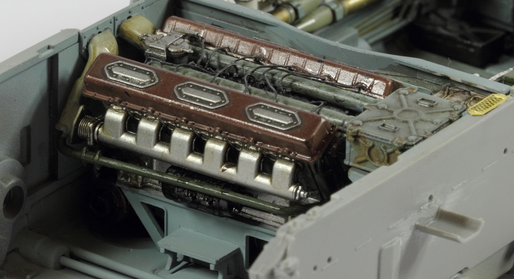 Добавил немного эффектов. Не желая переборщить, ободрал и припылил. Больше ничего внутри делать не буду. Начинаю закрывать внутрянку. Подготовил катки, звездочки. Загрунтовал, покрасил. Собираюстся металлические траки..