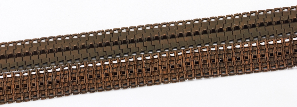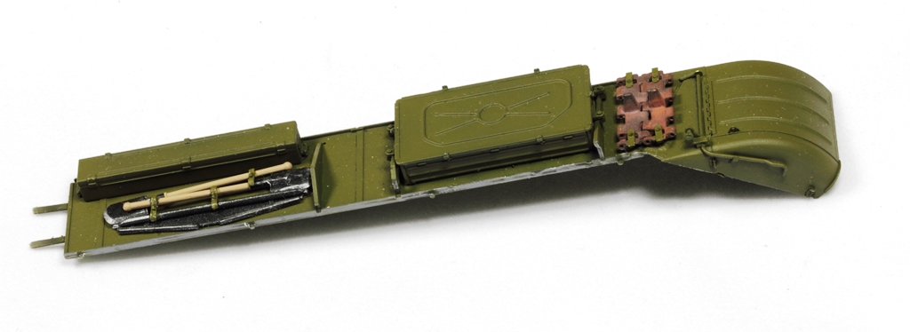 Левая надгусеничная полка с шанцевым инструментом. Поставить правильно инструментом на приклеенную полку проблематично. Установил инструмент, ну а потом уже сама полка вклеивается на место. Полка уже выкрашена. Впоследствии, при дальнейшей окраске танка она просто закроется маской. Ещё фото с траками после чернения. Родные ставить не хочу.