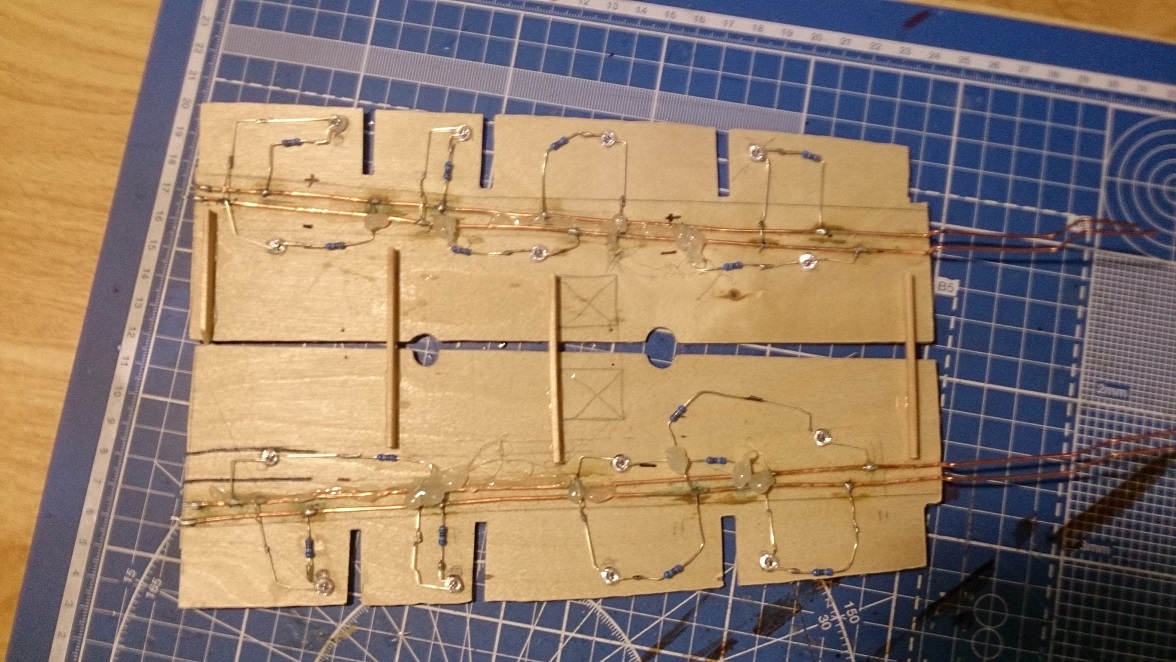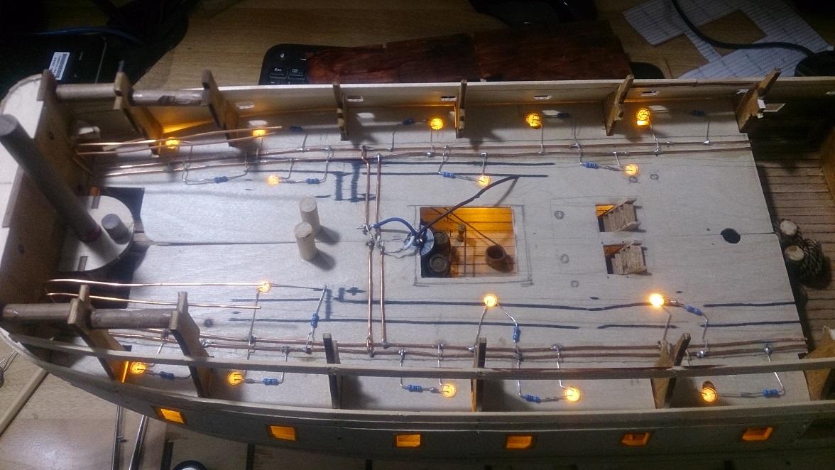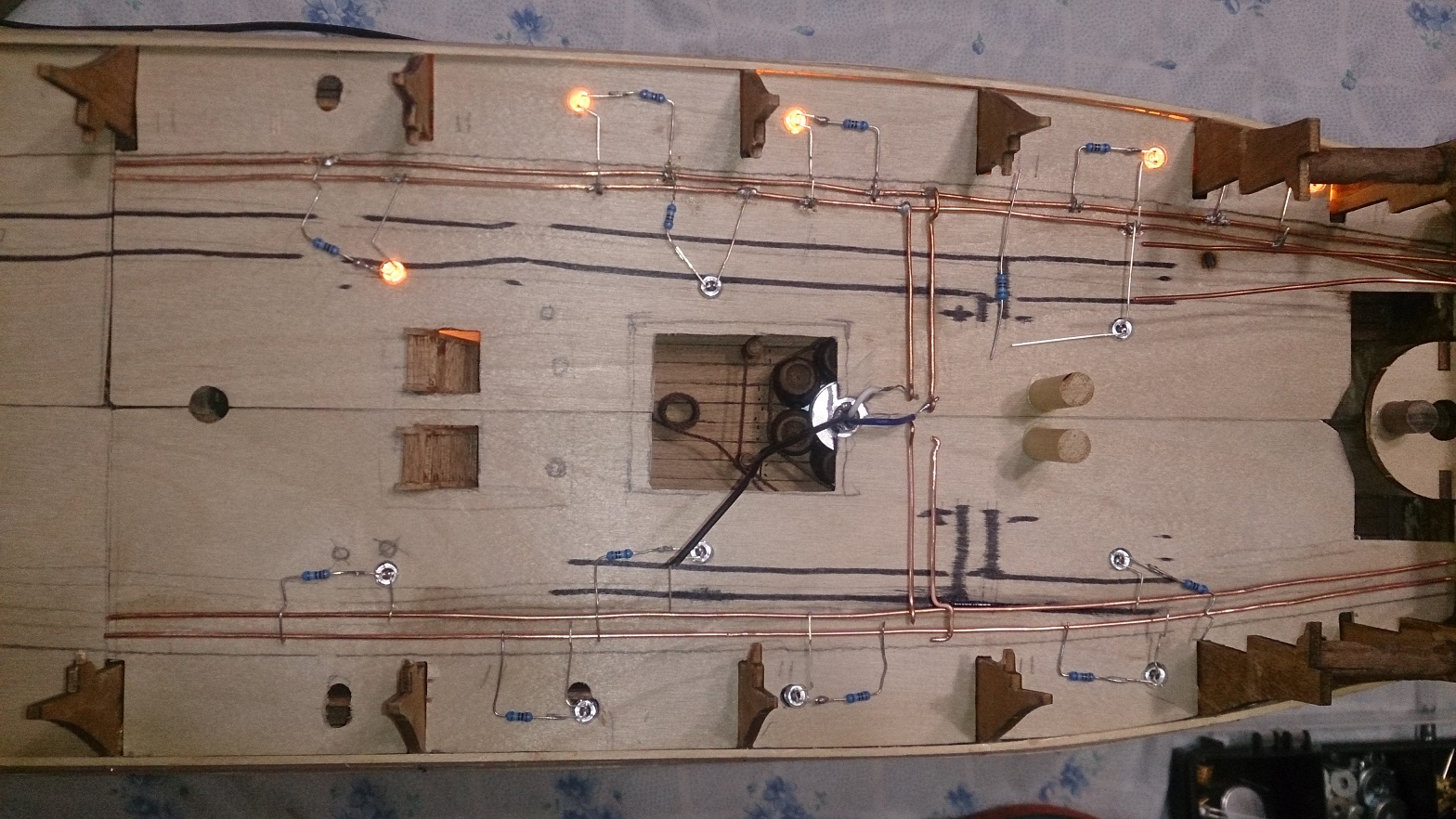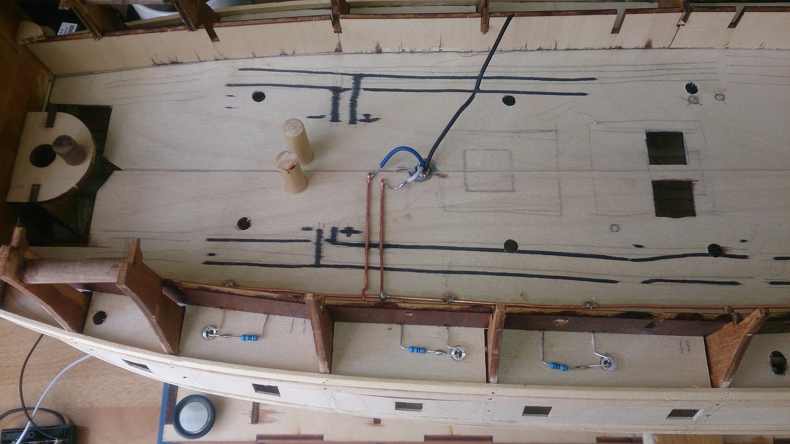 От носа до кормы по обеим сторонам идёт шина с медной проволоки 1,5мм. К этой шине будут припаины параллельно светодиоды соединяющие последовательно с резистором сопротивлением от 680 Ом..