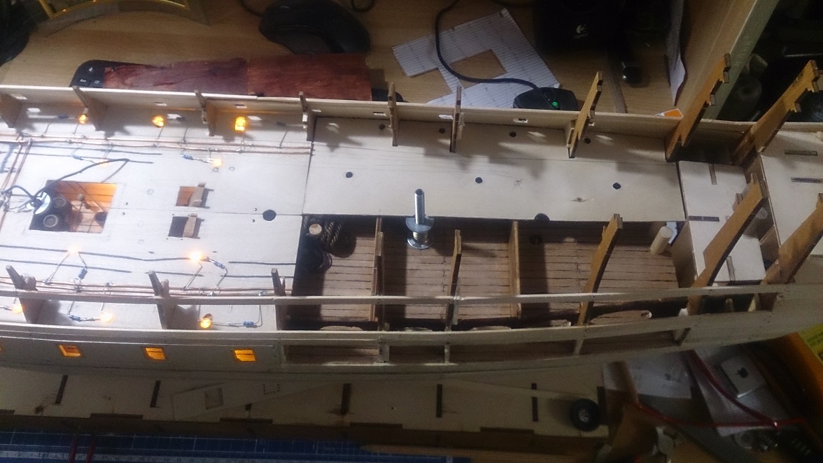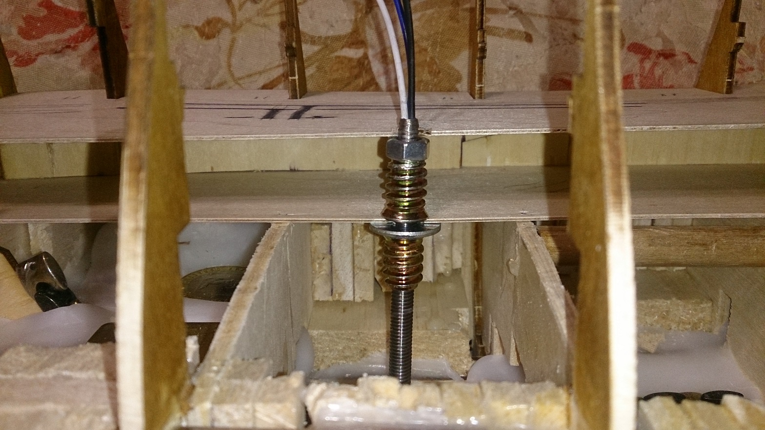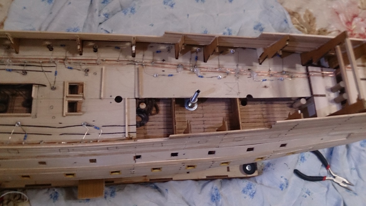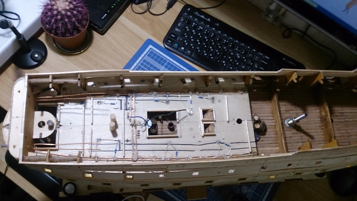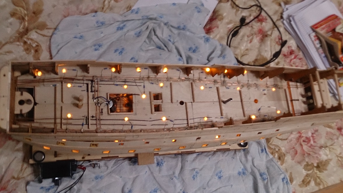От носа до кормы по обеим сторонам идёт шина с медной проволоки 1,5мм. К этой шине будут припаины параллельно светодиоды соединяющие последовательно с резистором сопротивлением от 680 Ом..