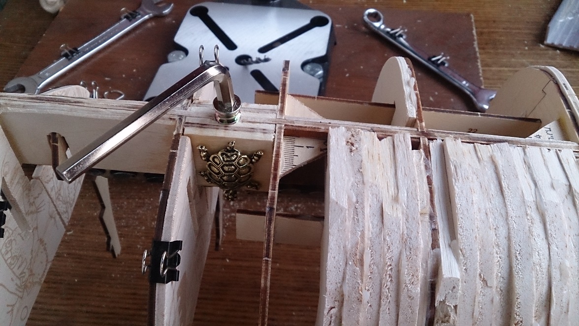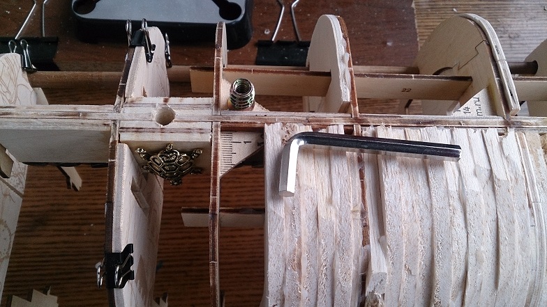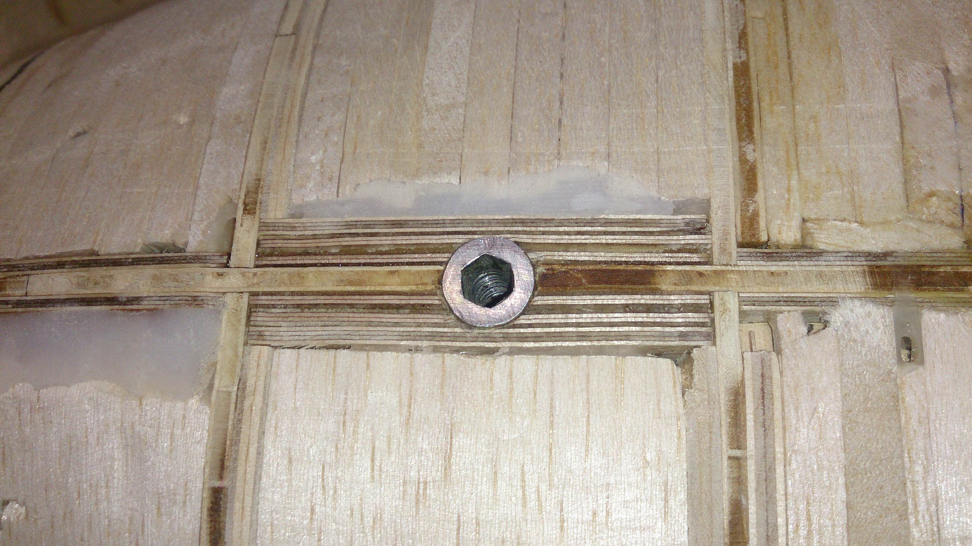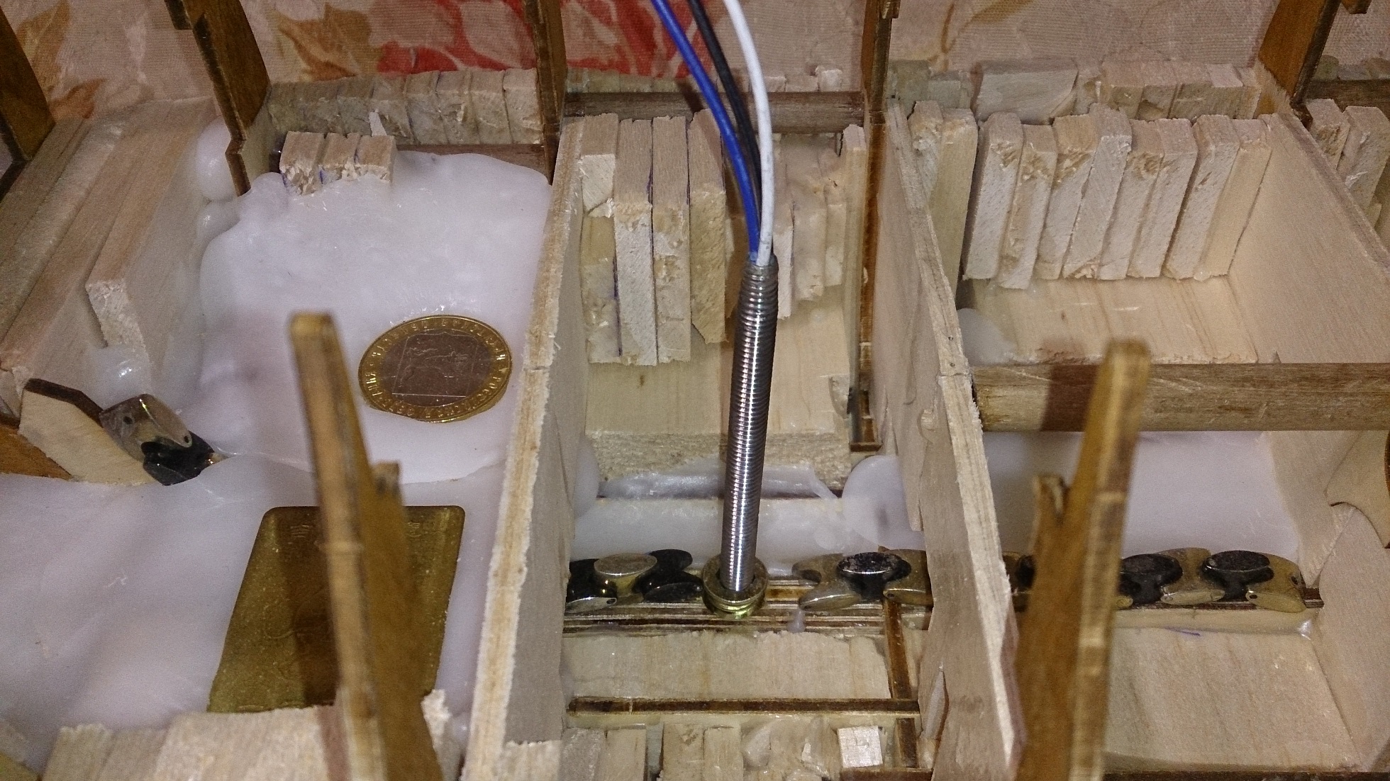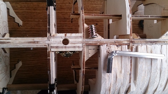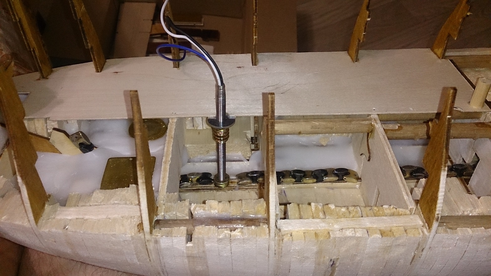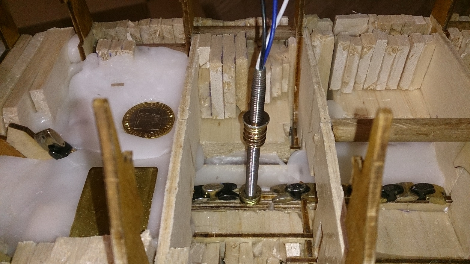 Это делается для того, чтобы в будущем можно было закручивать с низу через подставку модели две трубки с нарезанной резьбой М6, в которых будут проходить провода для подсветки пушечных портов и внутренних палуб". Сами гайки и трубки будут спрятаны внутри модели и будут незаметны для окружающих.