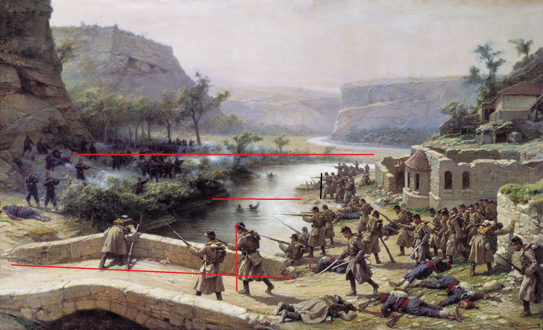 -вот линия по середине реки. у нее отношение к росту солдата который стоит на берегу 3.48 ед. и у меня 3.47 ед. (я взял фигурку она высотой 23мм.) через нее и считаю.