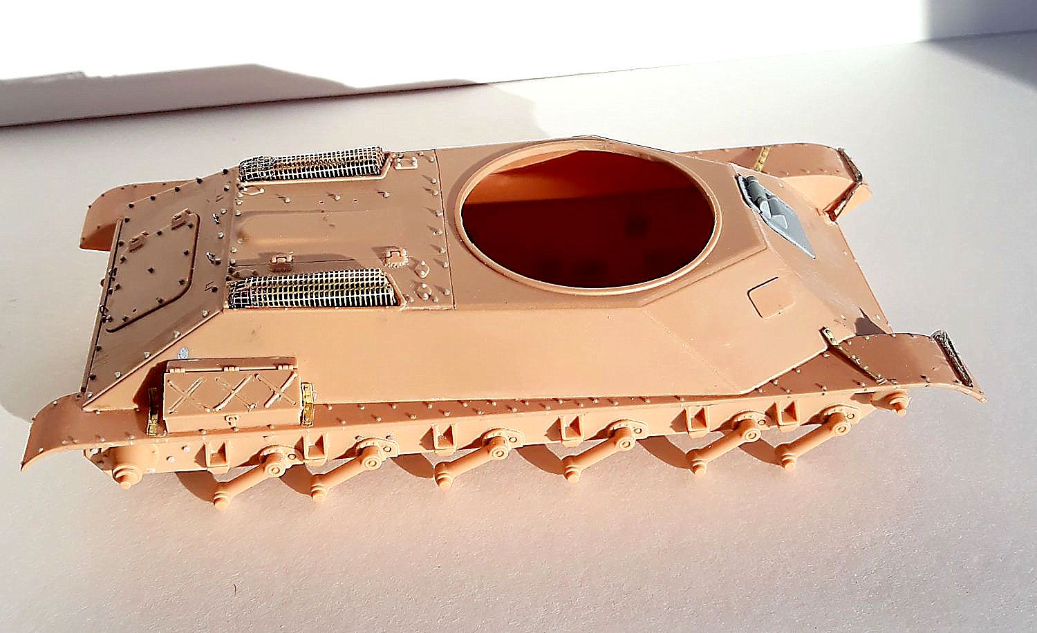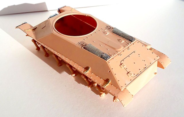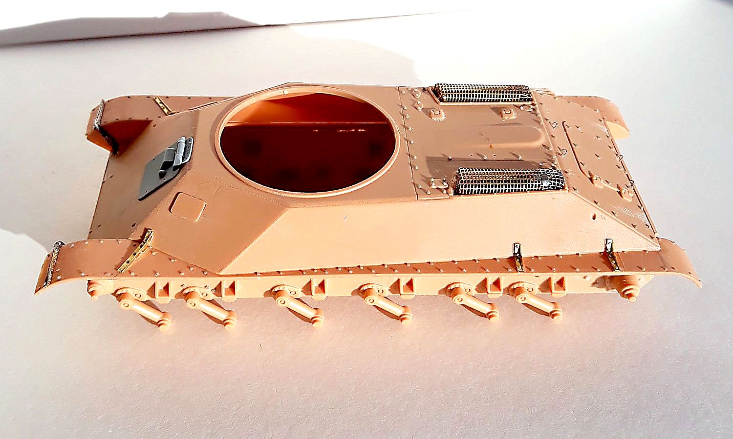 Пока собрал ванну корпуса, заменив "пупырышки от "ХБ" на болты от "МК" в местах крепления картера ведущих колес, поставил букстровочные крюки (их обварку еще буду делать). Также собрал ходовую. Дорабатывать ведущие колеса (ставить корончатые гайки и болты) не стал, т.к. они очень маленькие и под слоем пыли все равно будет не разобрать