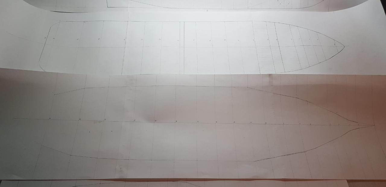 После шпангоутов начертил продольные палубы для усиления каркаса будущей модели. И тут такой кошмар вылез в носовой части... на проекции корпус все смотрелось замечательно. А на чертежах палуб были большие и резкие провалы борта и наоборот сильные выступы. Начал придавать им плавность путем уменьшения на 1,5 - 3мм ширины шпангоутов и наоборот - наращивать другие шпангоуты на те же величины. Потом перерисовывал сами шпангоуты. Изменял до плавных переходов, при этом стараясь сохранить переход бульбы и борта, а так же довольно сильный завал бортов. Зато корма изначально плавной получилась.Осталось сделать последние продольные связи на полубаке, которые будут идти по линии слома борта и можно будет переходить к постройке набора корпуса и модели в целом. Надеюсь что все косяки на чертежах удалось устранить и корпус будет с плавными линиями. Все равно перед постройкой уделю еще один вечер на контрольную инспекцию чертежей, чтобы убедиться в том, что все именно так, как должно быть и устранить возможные дефекты.
