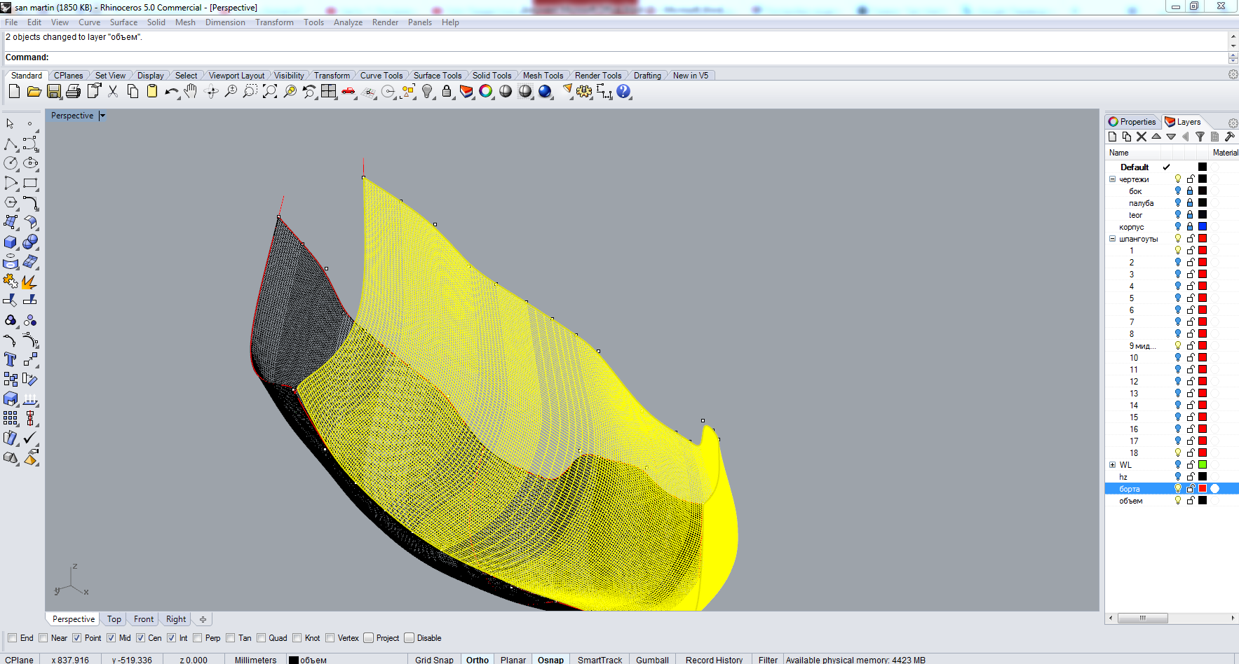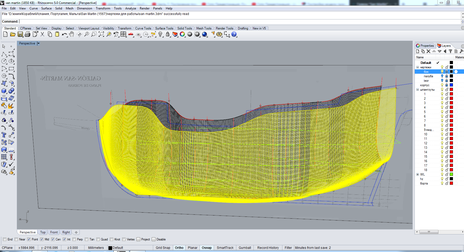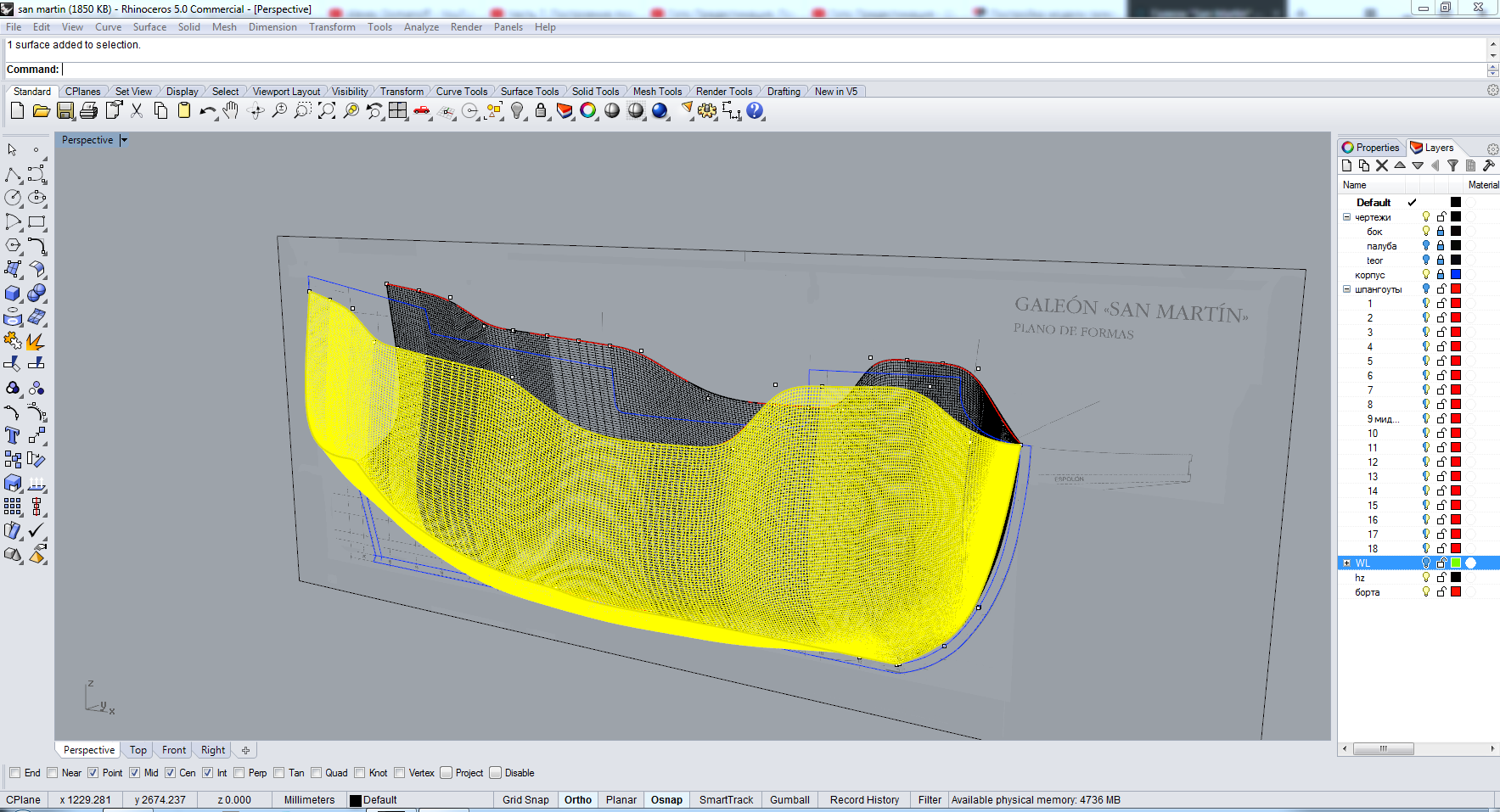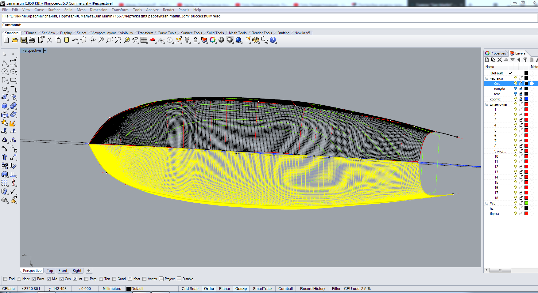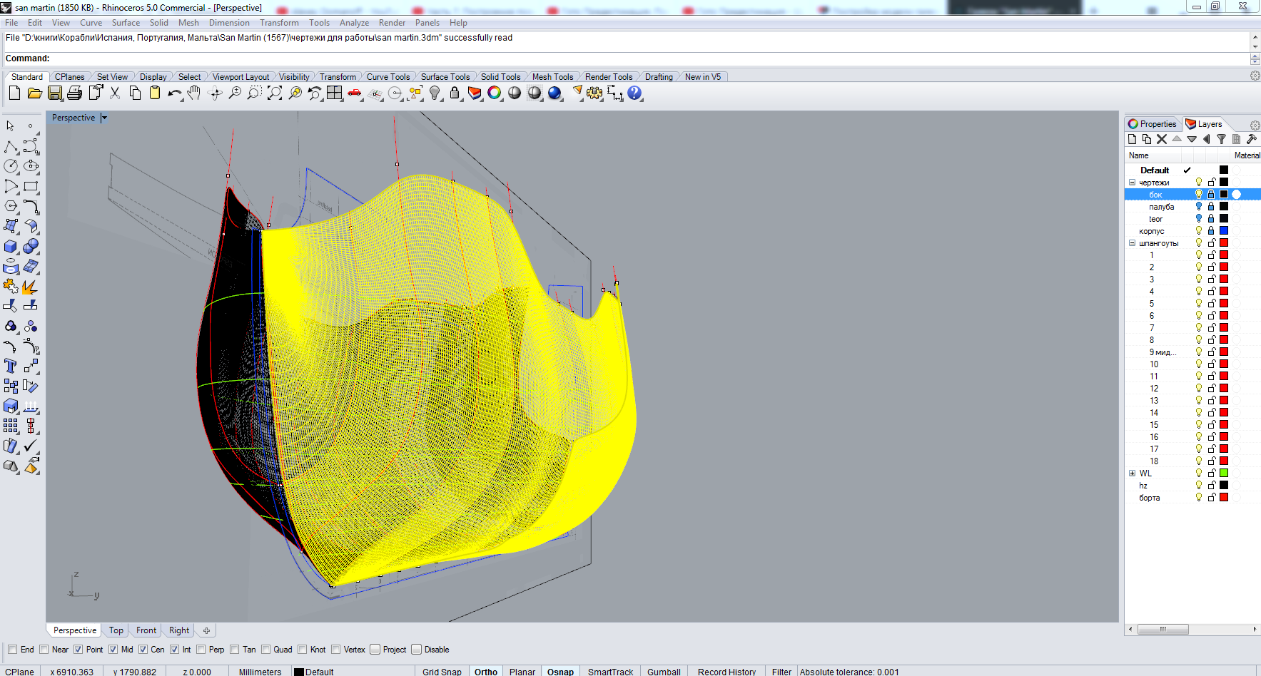 Продолжительные пляски с бубном вокруг этой программы позволили мне вчера получить первый результат - объемную модель корпуса. Картинки, может, и получились "слепые", но сделать принтскрин лучше мои навыки обращения с этой программой не позволяют. Для лучшего визуального восприятия один борт выделил желтым. Еще один нюанс: на модели планширь не будет таким волнообразным, просто я не сумел (да и не старался) его в программе отрисовать должным образом - для процесса в целом это не имеет ровным счетом никакого значения. Основной упор я сделал на точную состыковку линий шпангоутов и ватерлиний. На представленной модели они совпадают по всем точкам - где шпангоуты подтягивал к ватерлиниям, где наоборот. Всем линии выровнены для их плавности.